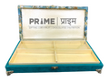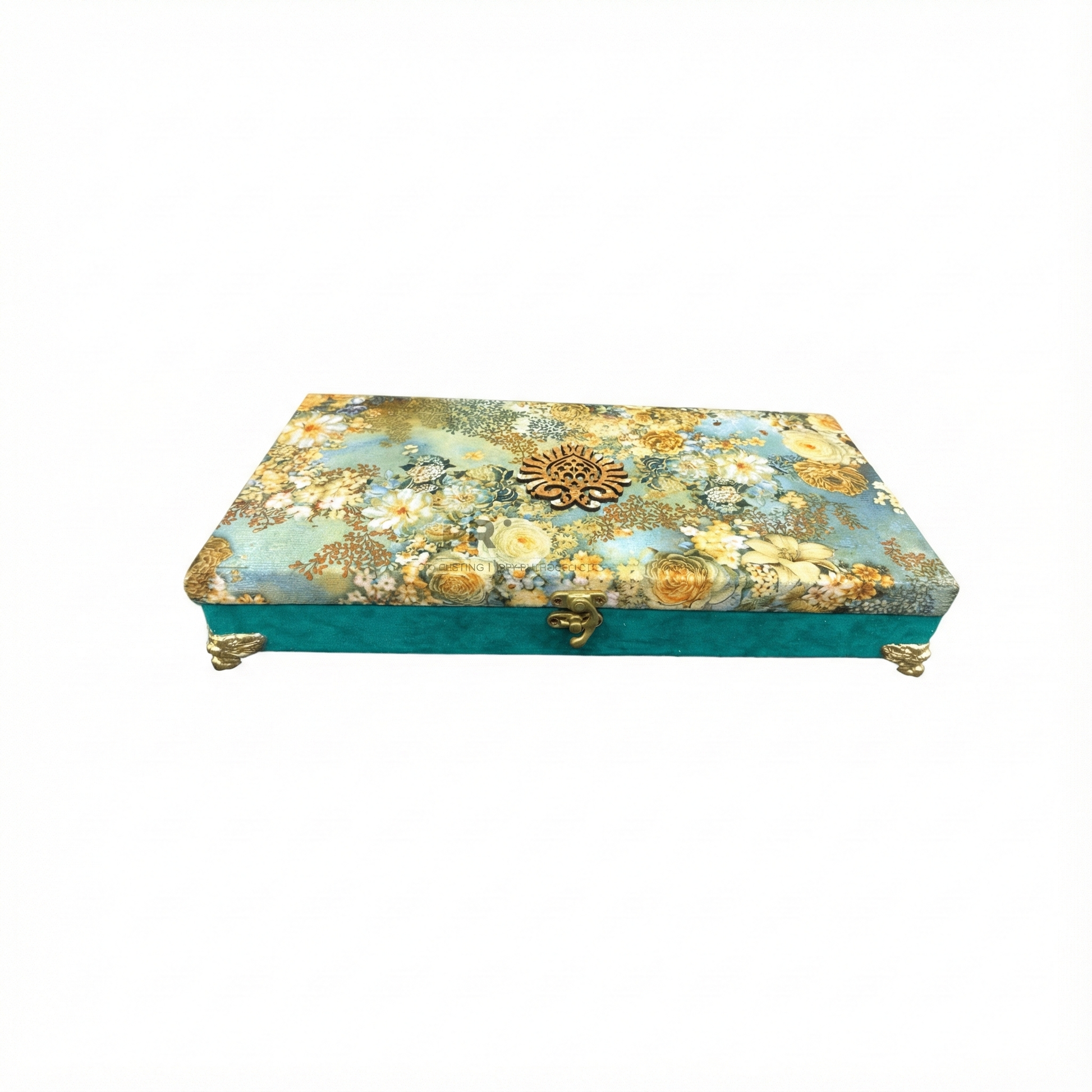 Add a touch of luxury to your festive gifting with this Designer Turquoise Velvet Gift Hamper Box, beautifully crafted to elevate every celebration. The top features an exquisite floral print in soft pastel tones, paired with a decorative golden emblem that enhances its royal appeal. The rich turquoise velvet sides and antique brass latch give the box a sophisticated finish.