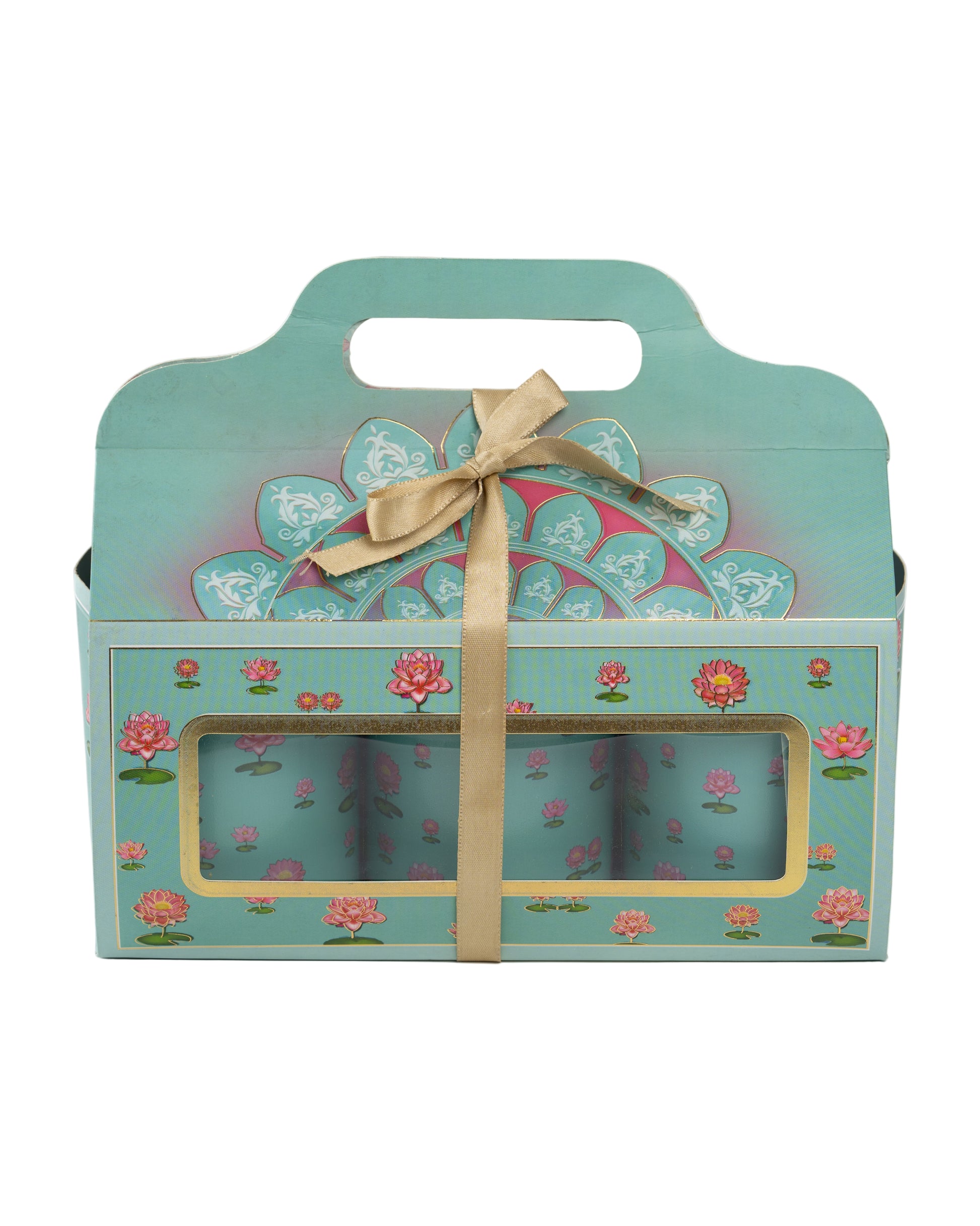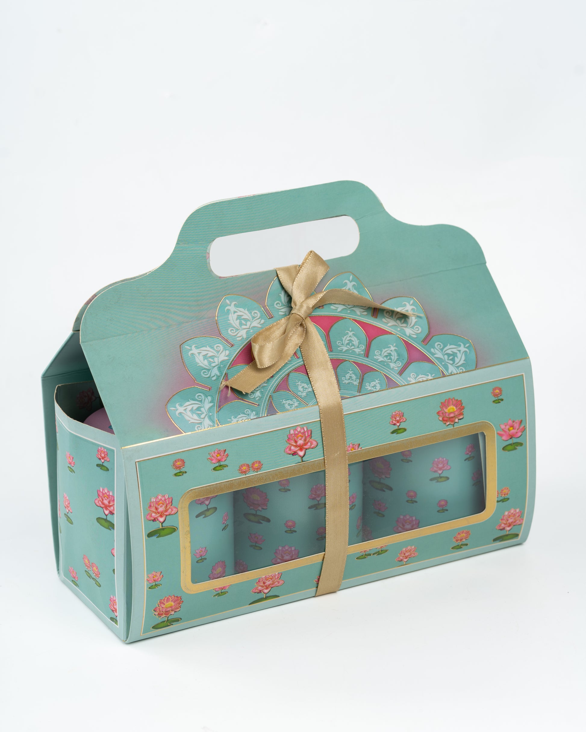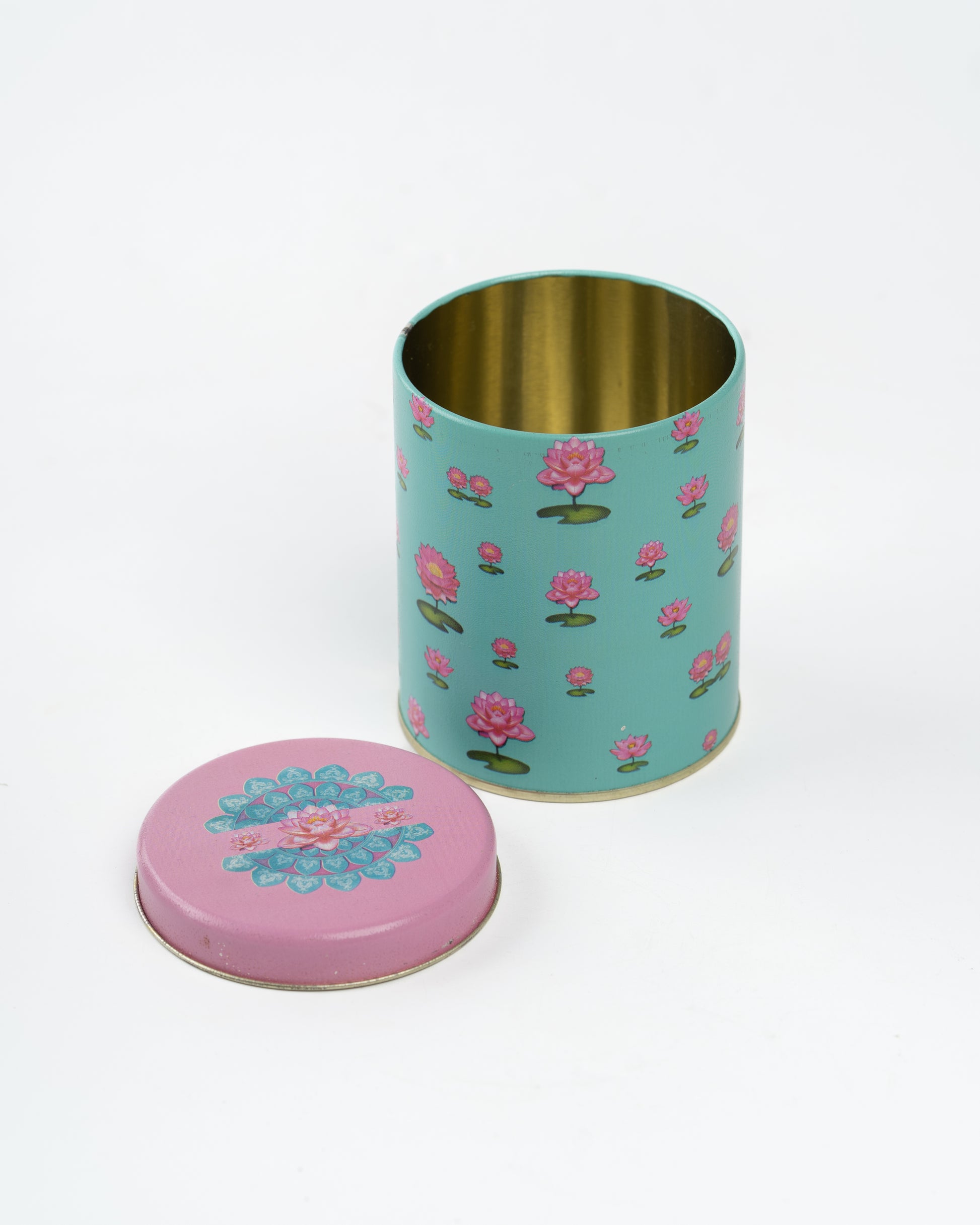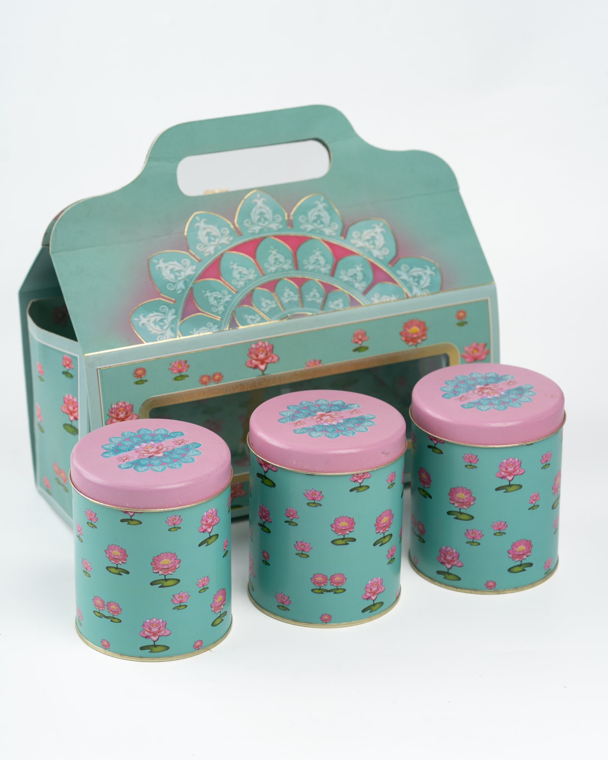 Add a touch of elegance to your gifting and storage needs with this Reusable Lotus Print Tin Container Set, beautifully presented in a designer carry-style gift box. Each tin container is adorned with vibrant lotus motifs on a soothing teal background, complemented by pastel pink lids featuring intricate mandala-inspired artwork. The coordinated gift box showcases matching lotus patterns and a clear front window for a refined display.