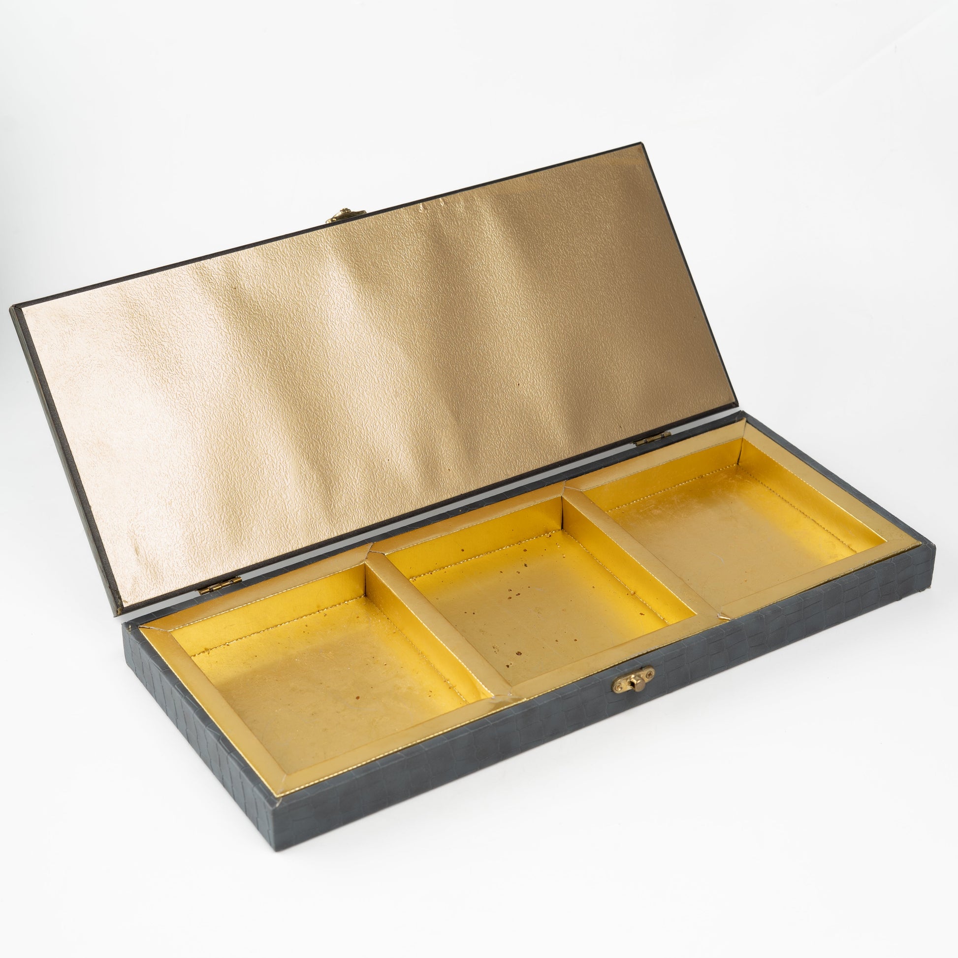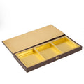 Inside, the box opens to reveal a three-section interior lined in metallic gold, offering practical organization for jewelry, dry fruits, collectibles, accessories, or corporate gifts. Its secure metal latch ensures contents stay protected, while the sturdy build provides long-lasting durability.