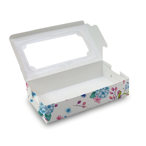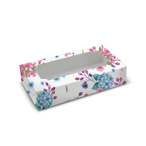 Showcase your baked creations with this Windowed Confectionery Box with Colorful Blossom Print, designed with a charming flower print and a clear window lid. Perfect for highlighting your delicious treats while keeping them safe and fresh.