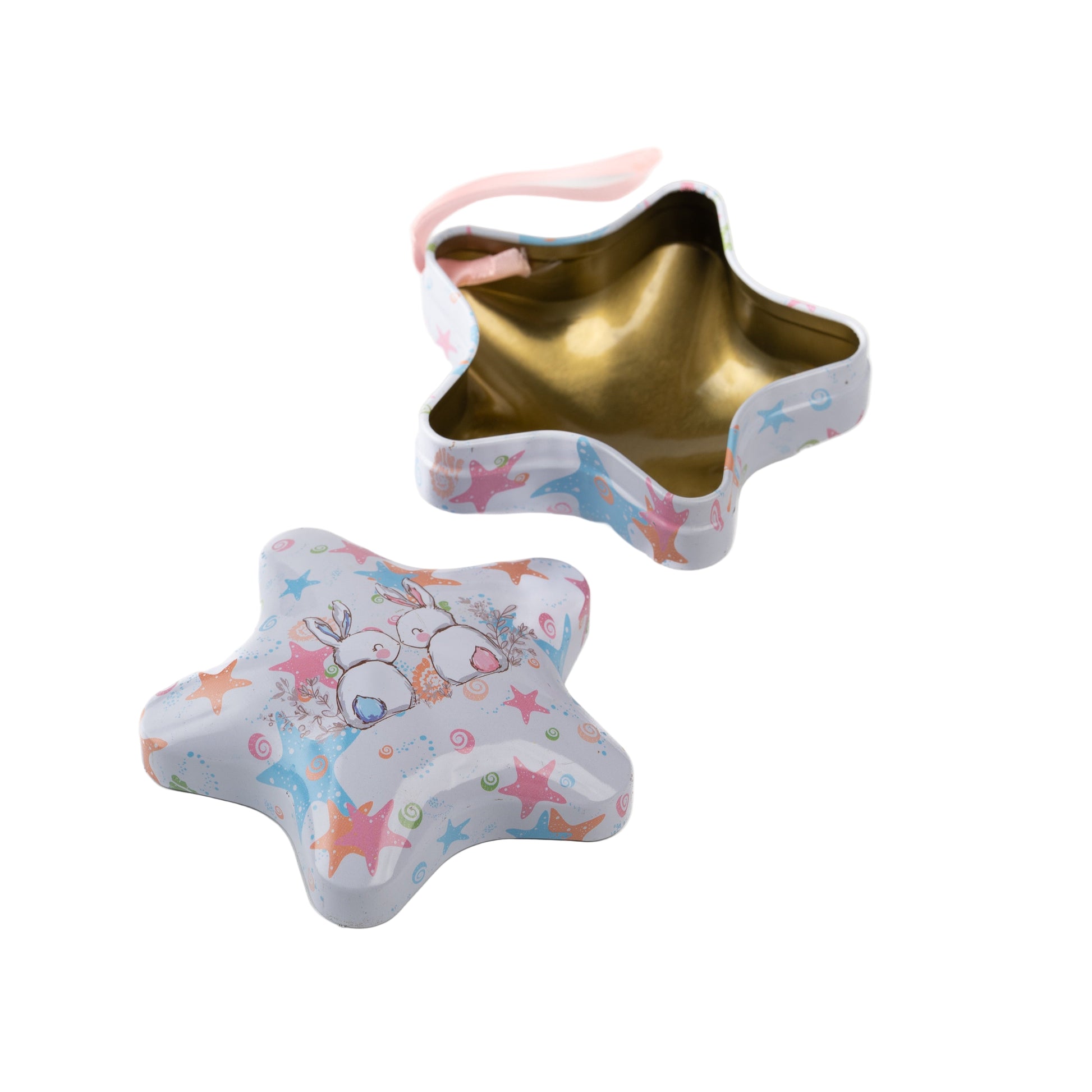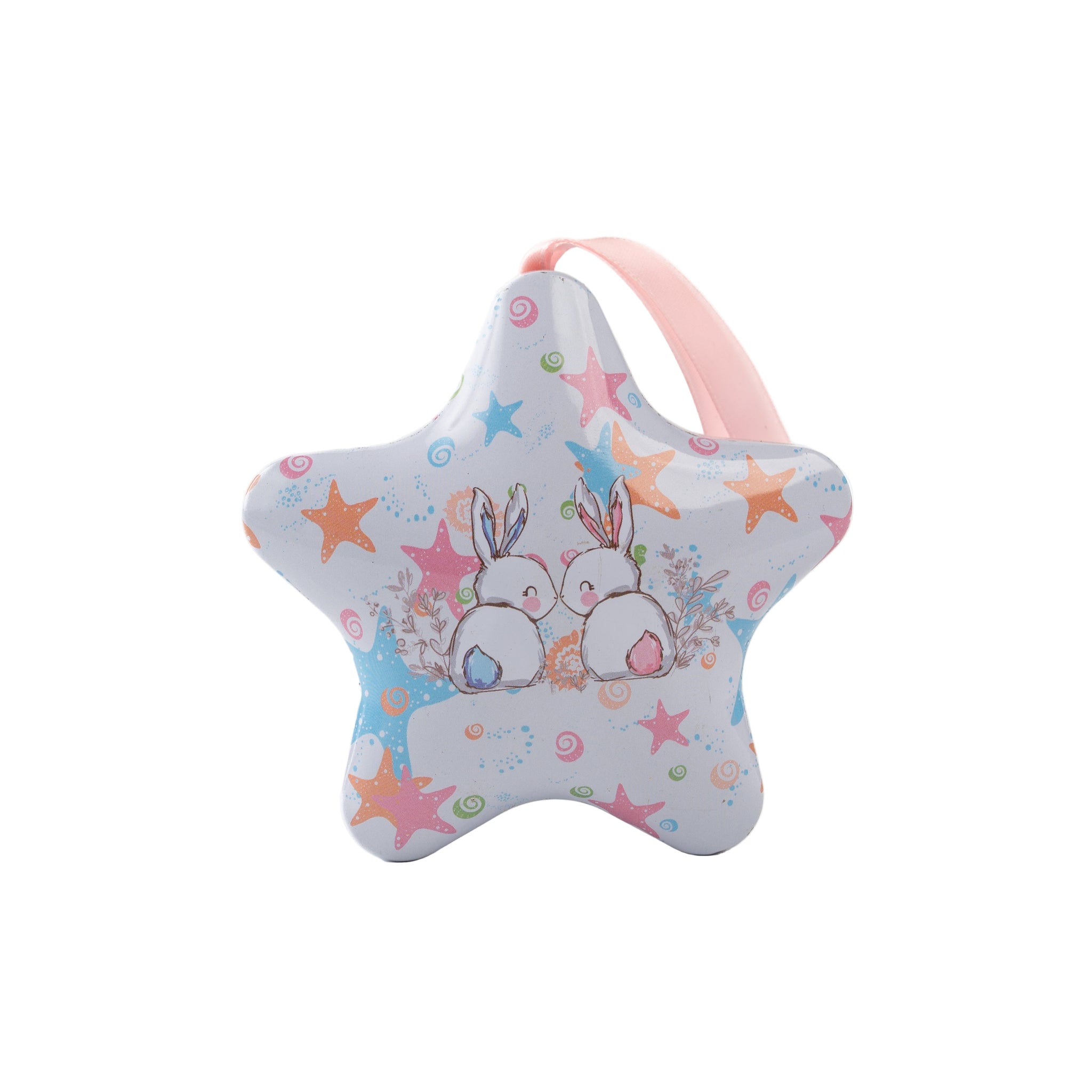 Delightful and dreamy, this Whimsical Star with Bunny Print Tin Metal Box is the perfect blend of playfulness and practicality. Designed in a soft pastel palette, the tin features two loveable Bunny illustration surrounded by colorful sea stars, swirls, and underwater-themed accents, making it a charming choice for kids' gifts, party favors, or decorative storage.