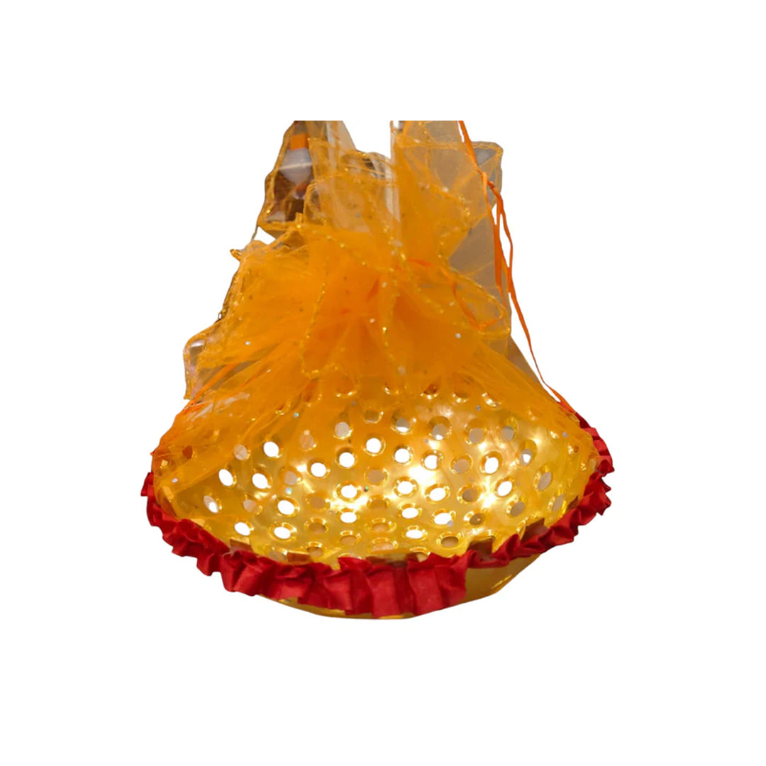 Make your festive gifting truly eye-catching with this beautifully crafted decorative basket featuring a vibrant orange and blue net cover along with a bold red ribbon border. Designed to enhance the presentation of sweets, chocolates, dry fruits, wedding favors, and festive hampers, this basket delivers elegance and celebration in every detail. Lightweight yet durable, it is perfect for festivals, pooja arrangements, party returns, and premium gift packaging. A stylish and reusable basket that adds a festive sparkle to any occasion.