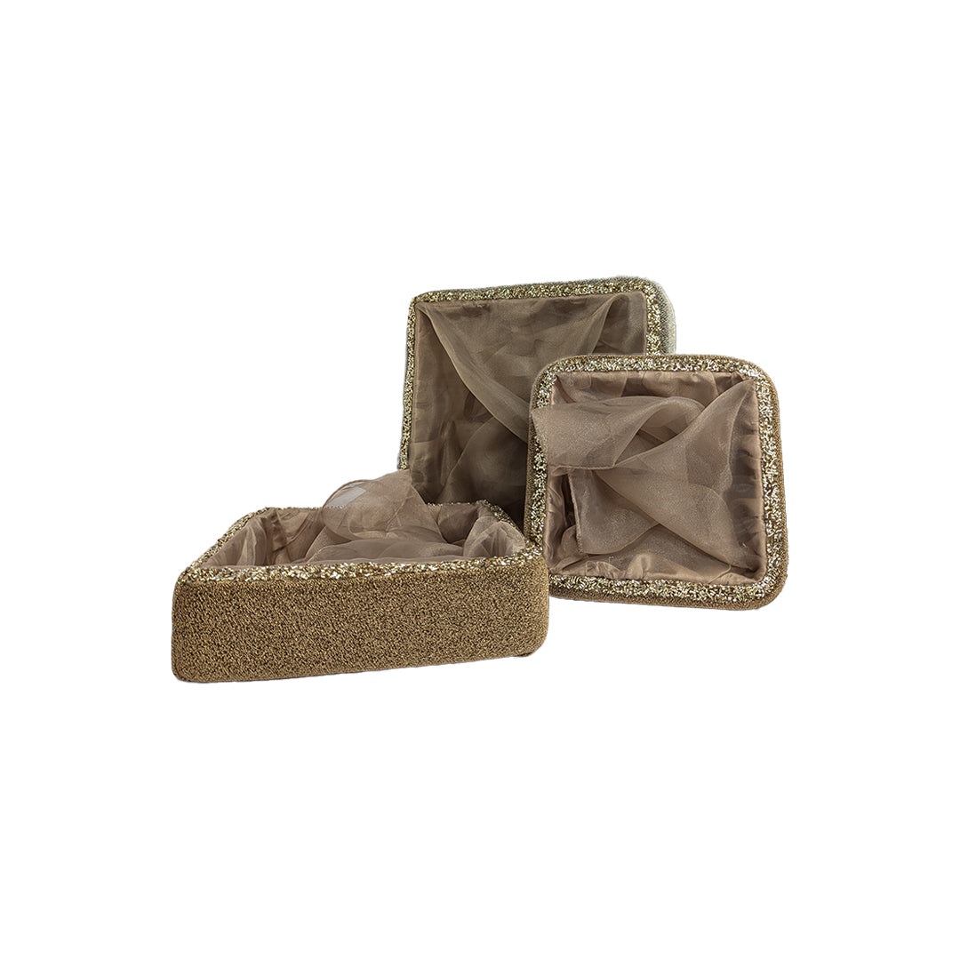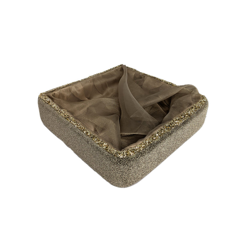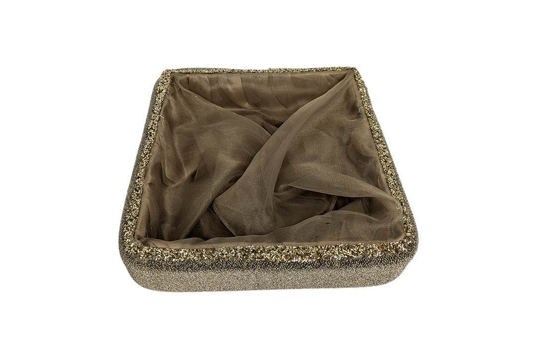 Elevate your gifting or home décor with this Gold Glitter Velvet-Lined Decorative Storage Basket featuring a sparkling gold exterior and soft net lining. Ideal for festive occasions, weddings, or elegant storage, this designer basket combines traditional charm with contemporary elegance. The intricately embellished trim and plush textured sides create a rich and premium presentation, making it perfect for showcasing gifts, dry fruits, or personal accessories.