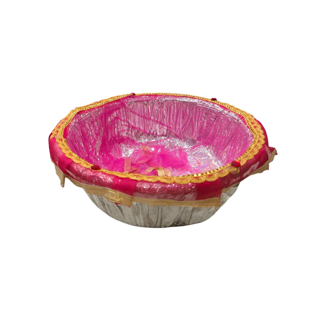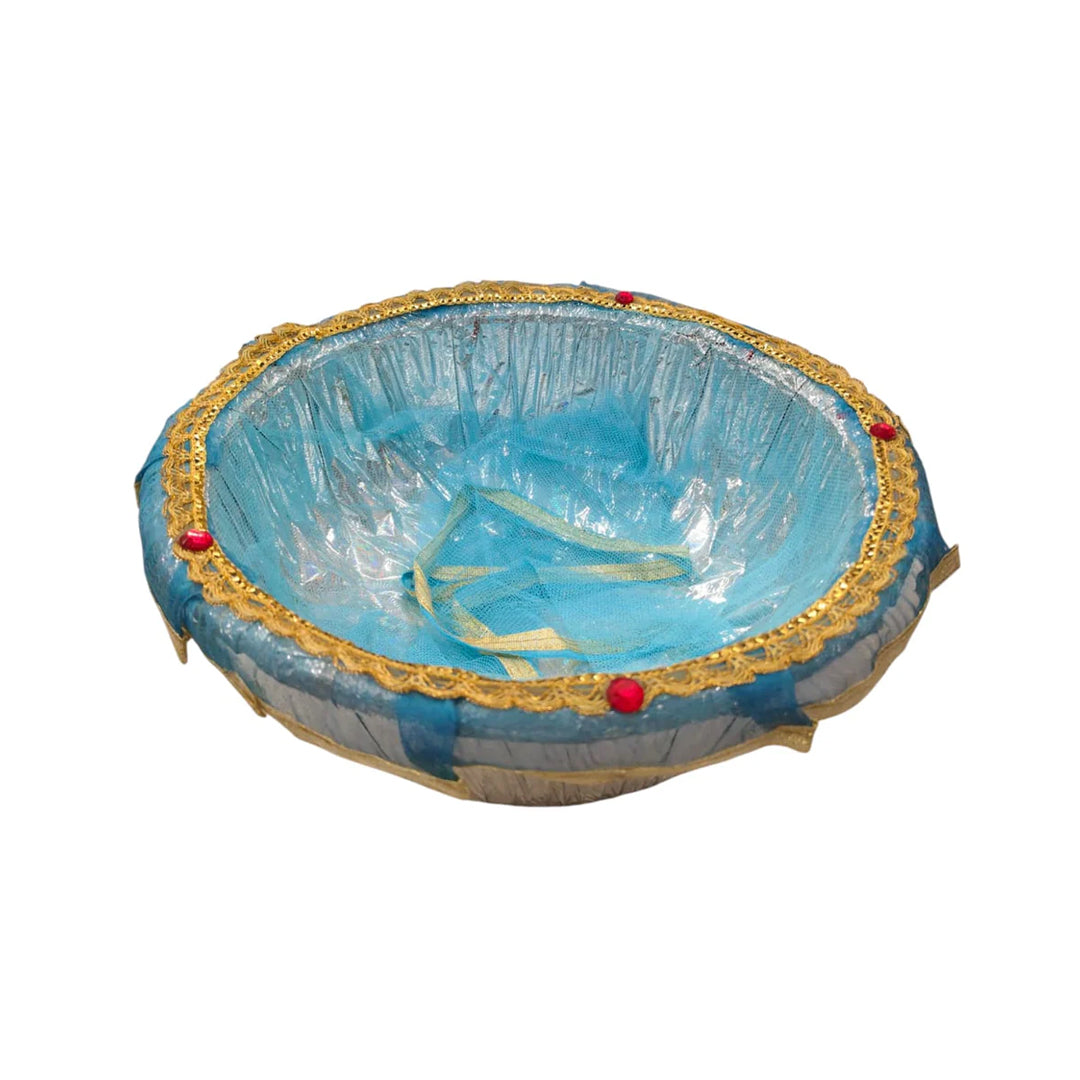 Add charm to your celebrations with this Elegant Blue Gift Basket, beautifully handcrafted with shimmering silver-blue net fabric, golden lace detailing, and decorative accents. Lightweight yet sturdy, it is perfect for presenting gifts in style at weddings, engagements, birthdays, festivals, or special occasions.