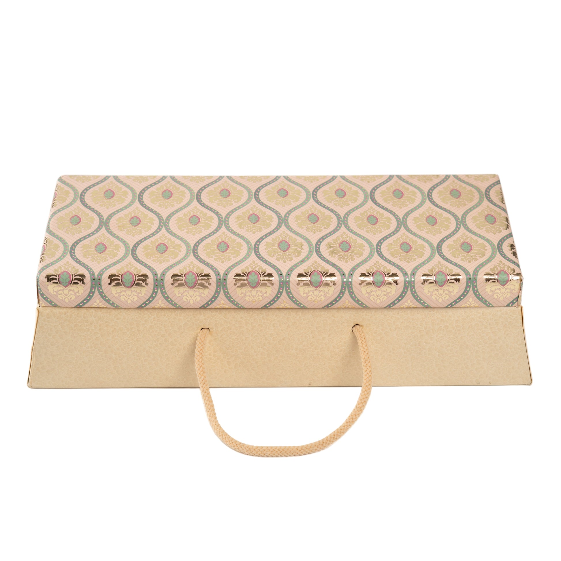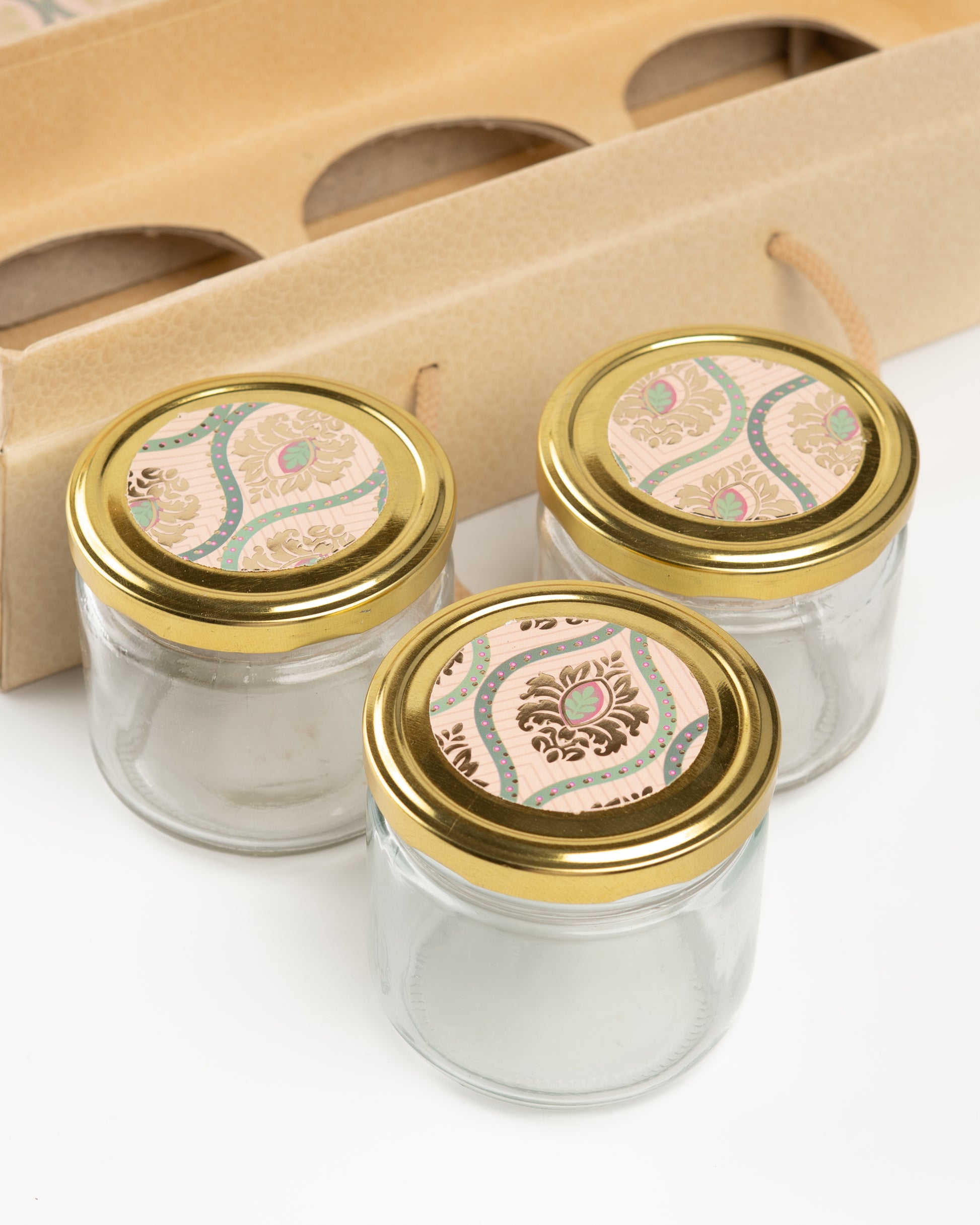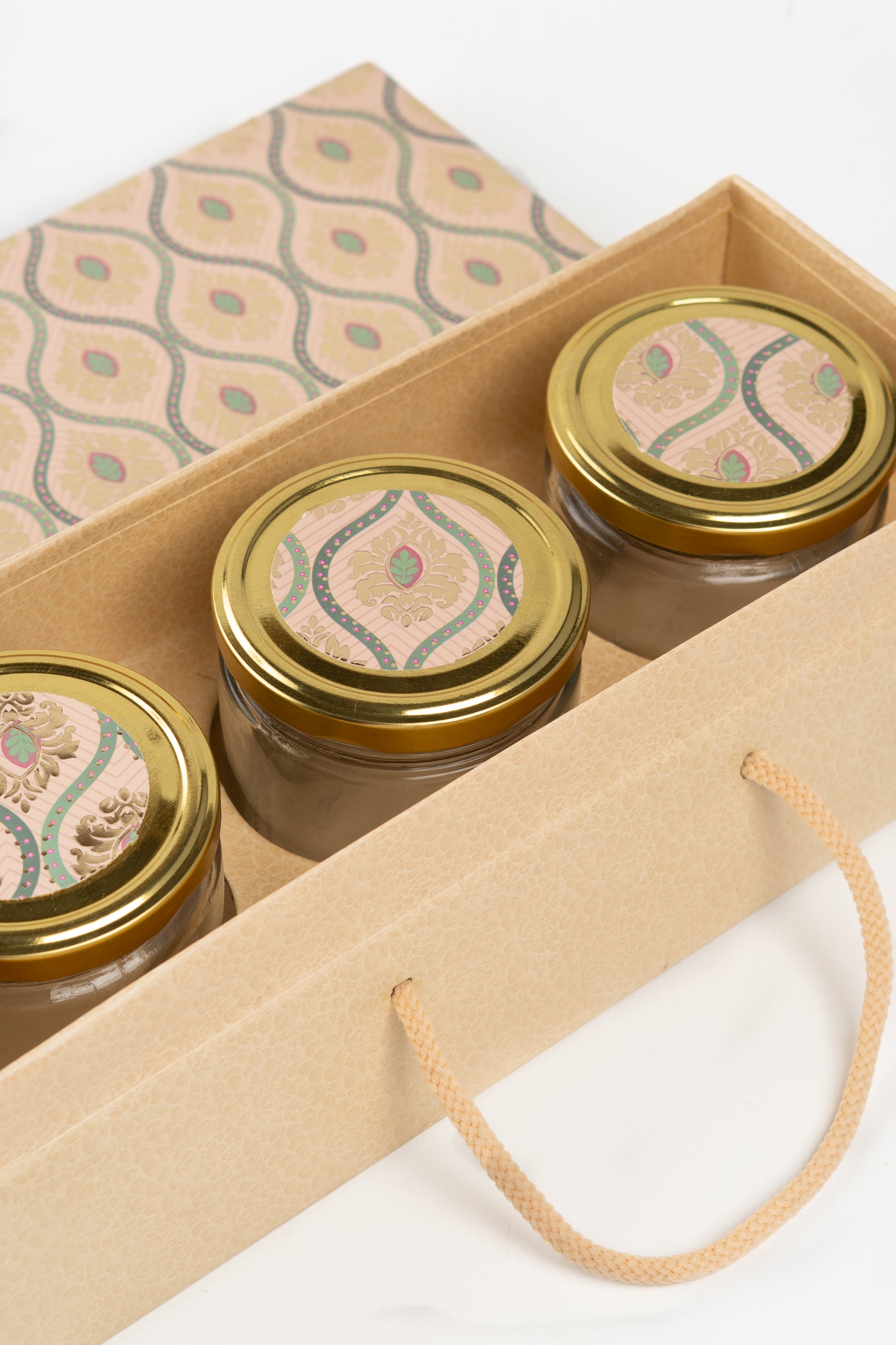 Present your gifts in style with this Ethnic Print Box with 3 Glass Jars, designed with an elegant ethnic-inspired pattern on the lid and a sturdy kraft-textured base. Crafted from high-quality rigid board and featuring a smooth rope handle, this box blends practicality with refined aesthetics—perfect for festive gifting, corporate hampers, artisanal food products, or premium jar packaging.