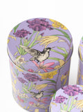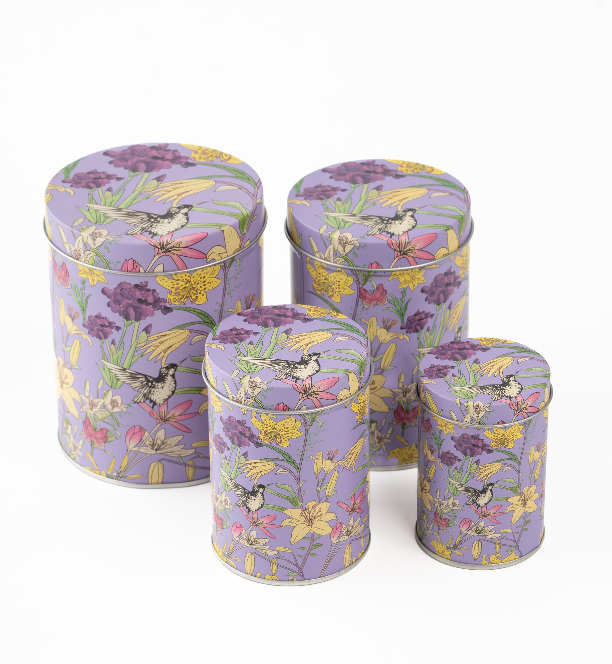 Bring elegance and charm to your kitchen or home with this beautiful set of 4 Floral Bird Print Metal Storage Tins. Featuring a vintage-inspired floral and bird design on a soft purple background, these tins are perfect for storing tea, coffee, sugar, cookies, candies, spices, or small household items. Each tin comes with a secure fitted lid to keep contents fresh while adding a touch of style to your countertops, pantry, or shelves. The tins nest inside each other for convenient storage when not in use, making them both practical and decorative.