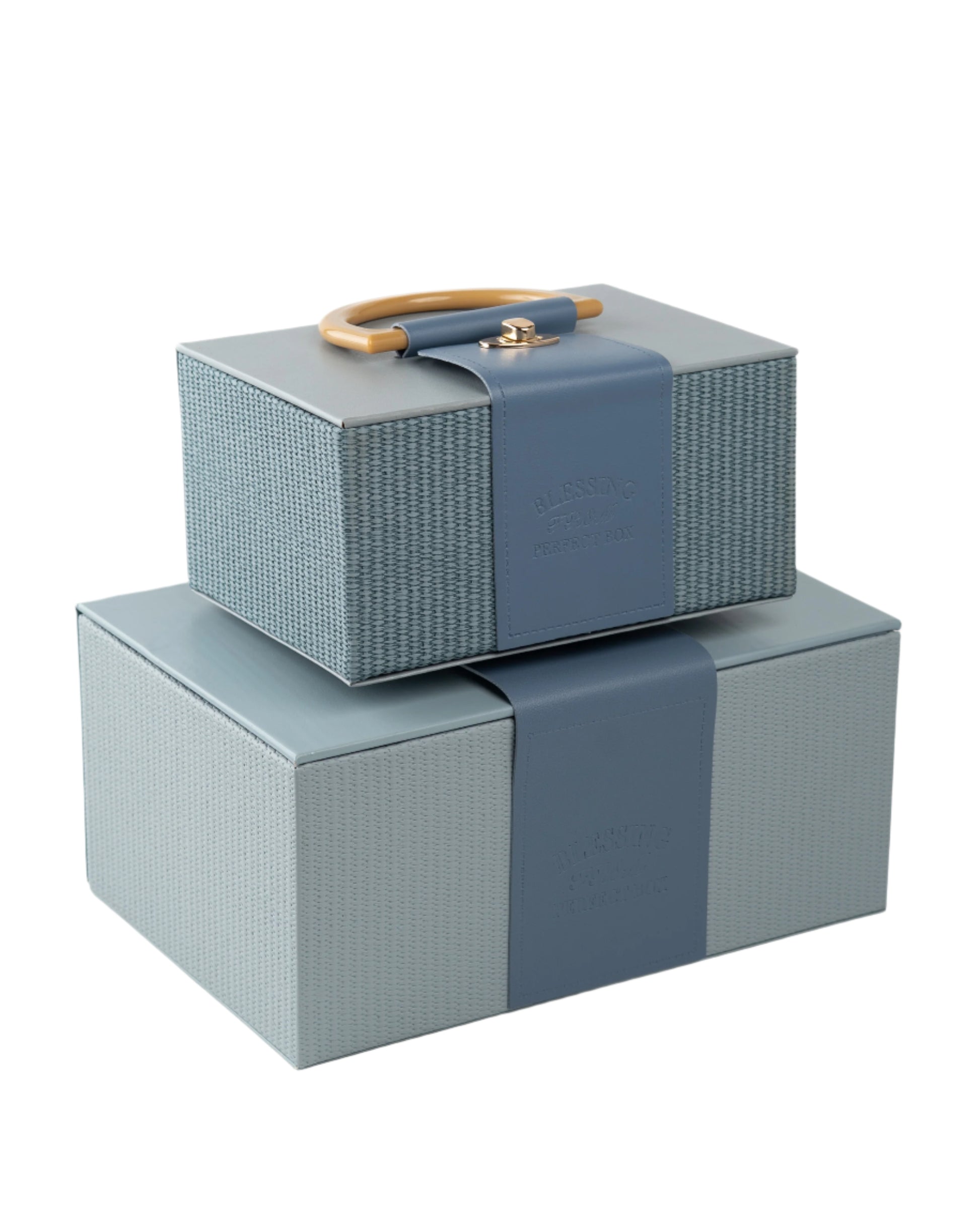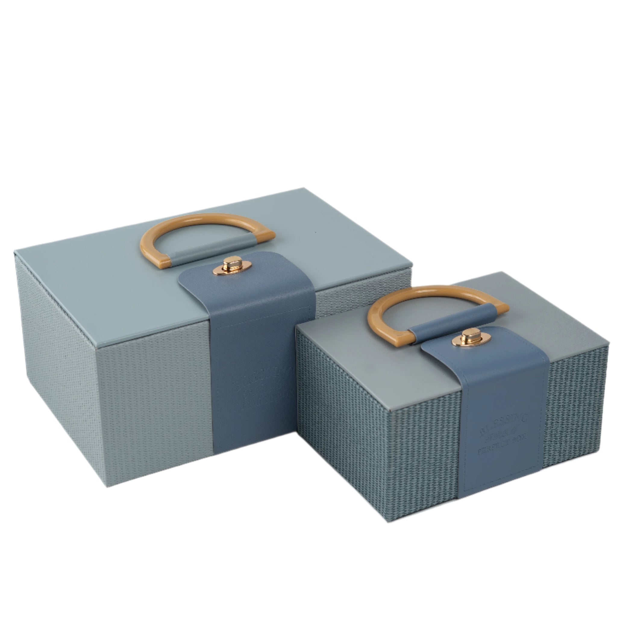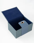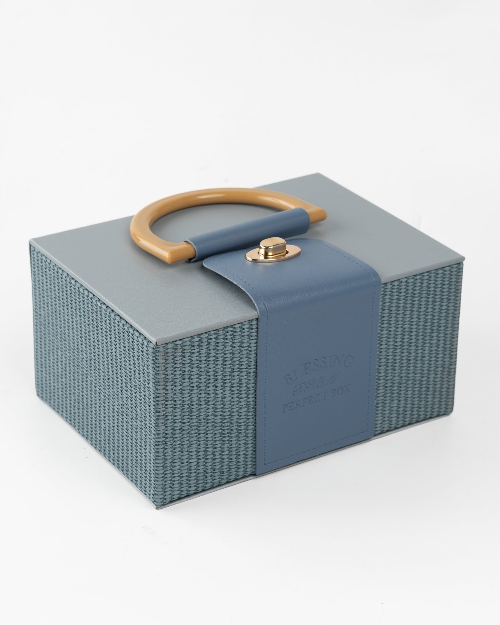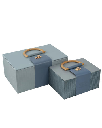 Elevate your gifting or storage experience with our Handbag Textured Paper Box with Lid & Handle. This premium box set includes two sizes, beautifully crafted with a woven-texture finish and smooth faux leather detailing. Each box features a sturdy lid and a stylish top handle with a gold-tone lock accent, combining practicality with sophisticated design. The interior is lined with plush navy fabric to protect delicate items and enhance presentation.
