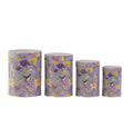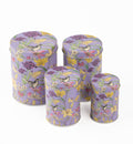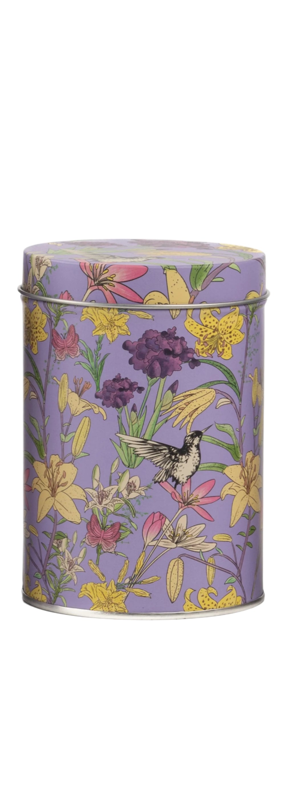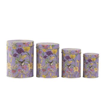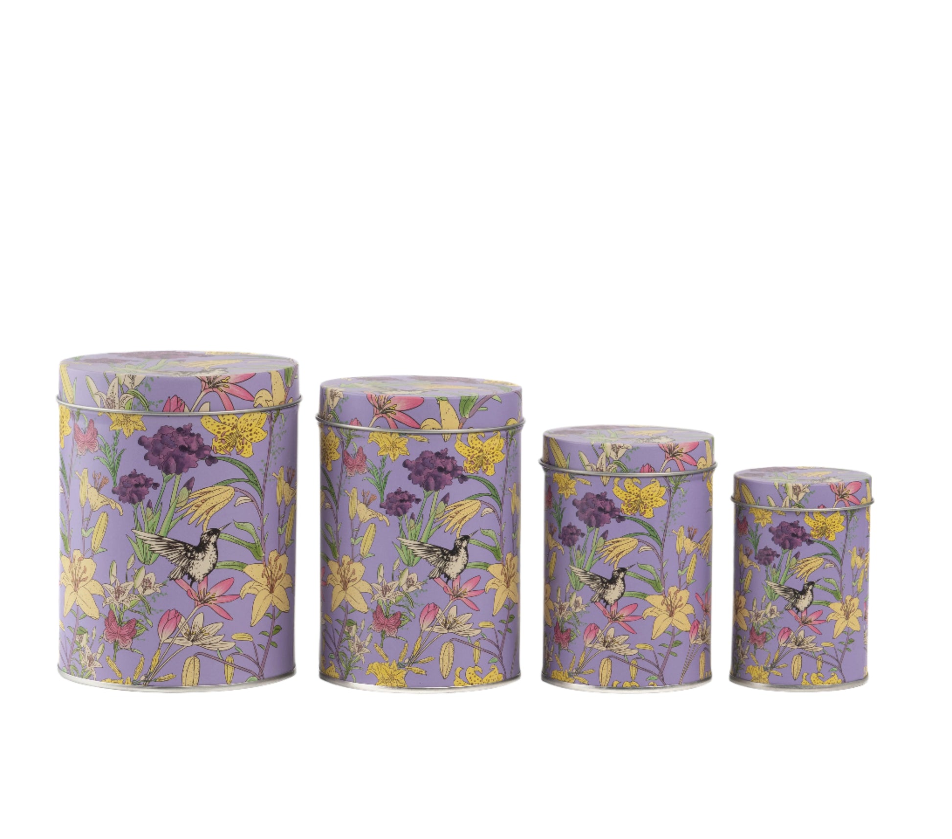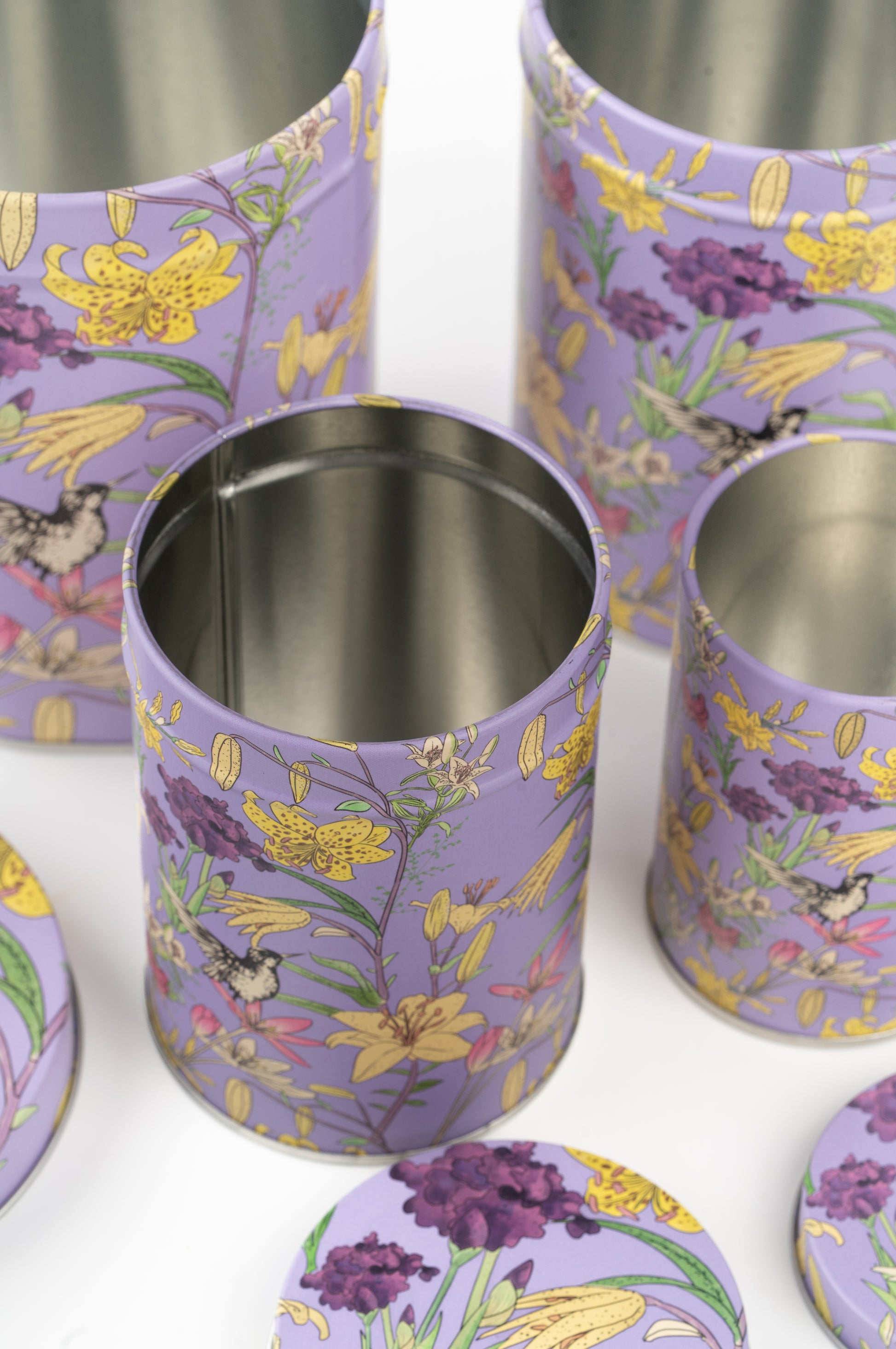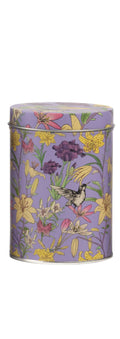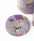 Add a touch of elegance and charm to your storage solutions with this beautifully crafted floral tin canister set. Featuring a vibrant purple base adorned with intricate floral patterns and delicate hummingbird illustrations, these canisters effortlessly blend functionality with aesthetic appeal. The soft color palette and botanical motifs make them an eye-catching addition to any kitchen, pantry, or home décor setup.