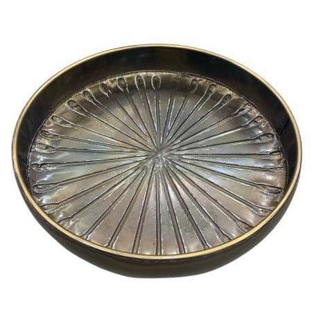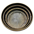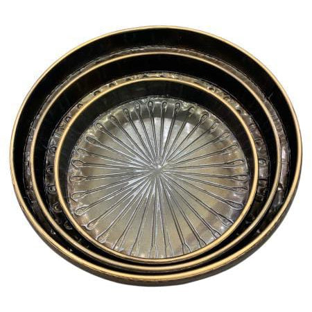 Featuring a radiant radial pattern etched into a sleek silver-toned base and framed with a rich gold-finished rim, these trays are the perfect accent for any coffee table, console, or dining space. Each tray nestles effortlessly into the next, offering a space-saving design with standout appeal.