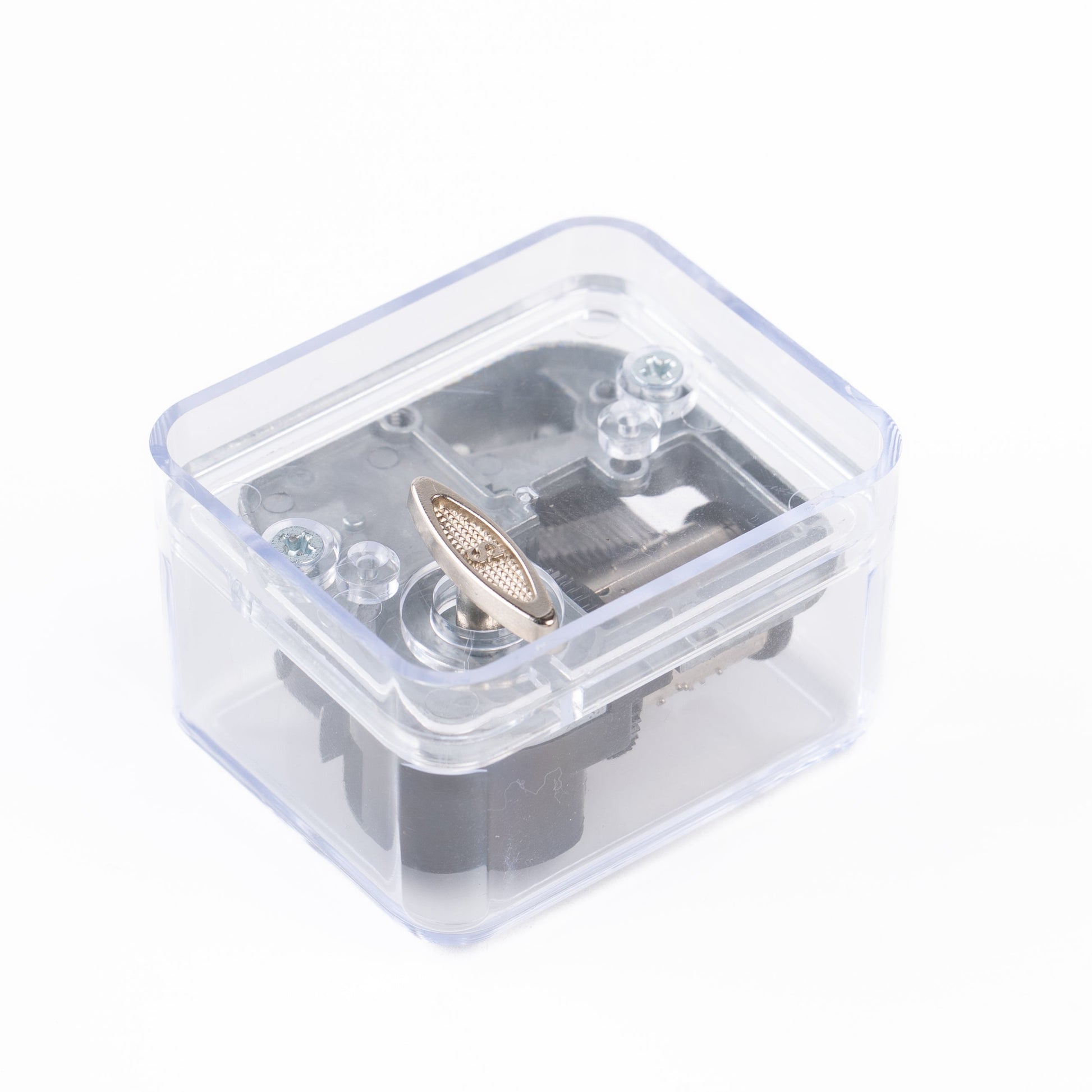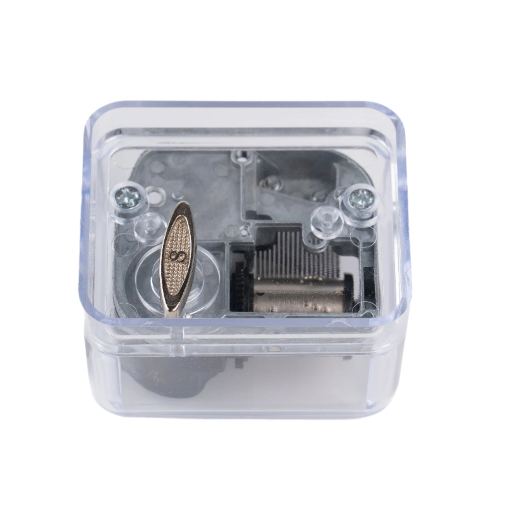 Delight in the timeless charm of the Crystal Tune Key Mechanism Music Box, measuring a compact under 10 cm on each side. Each order comes in a convenient package of 10 boxes, making it perfect for personal collections, party favors, or thoughtful gifts. The transparent acrylic casing showcases the intricate inner workings, letting you see every gear and cylinder in motion as you turn the handle to play its enchanting melody.
