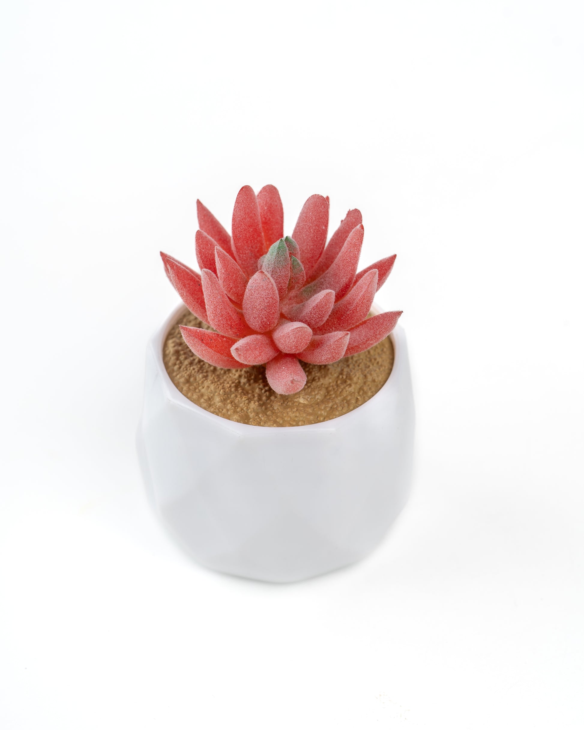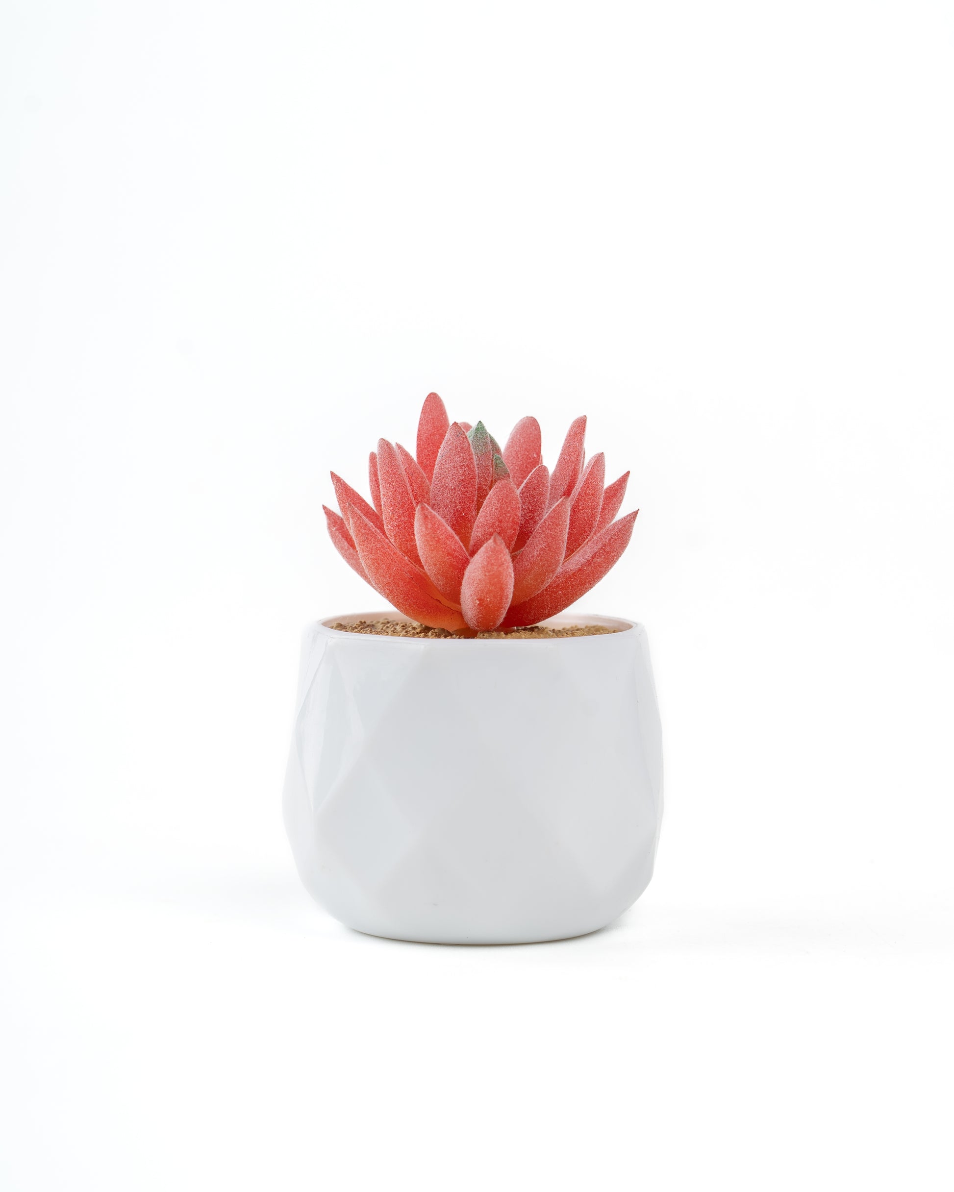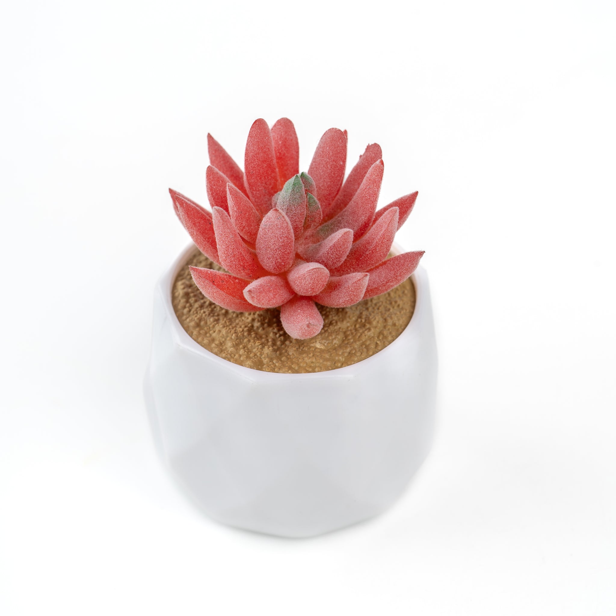 Add a splash of elegance and color to your space with our Velvet Touch Mini Faux Succulent, perfectly nestled in a stylish white geometric ceramic pot. Measuring 6x6x9 cm, this compact yet striking décor piece is ideal for desks, shelves, coffee tables, and windowsills.
