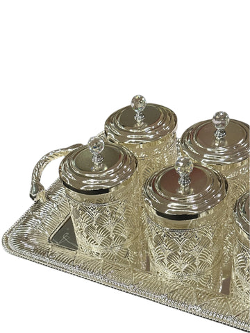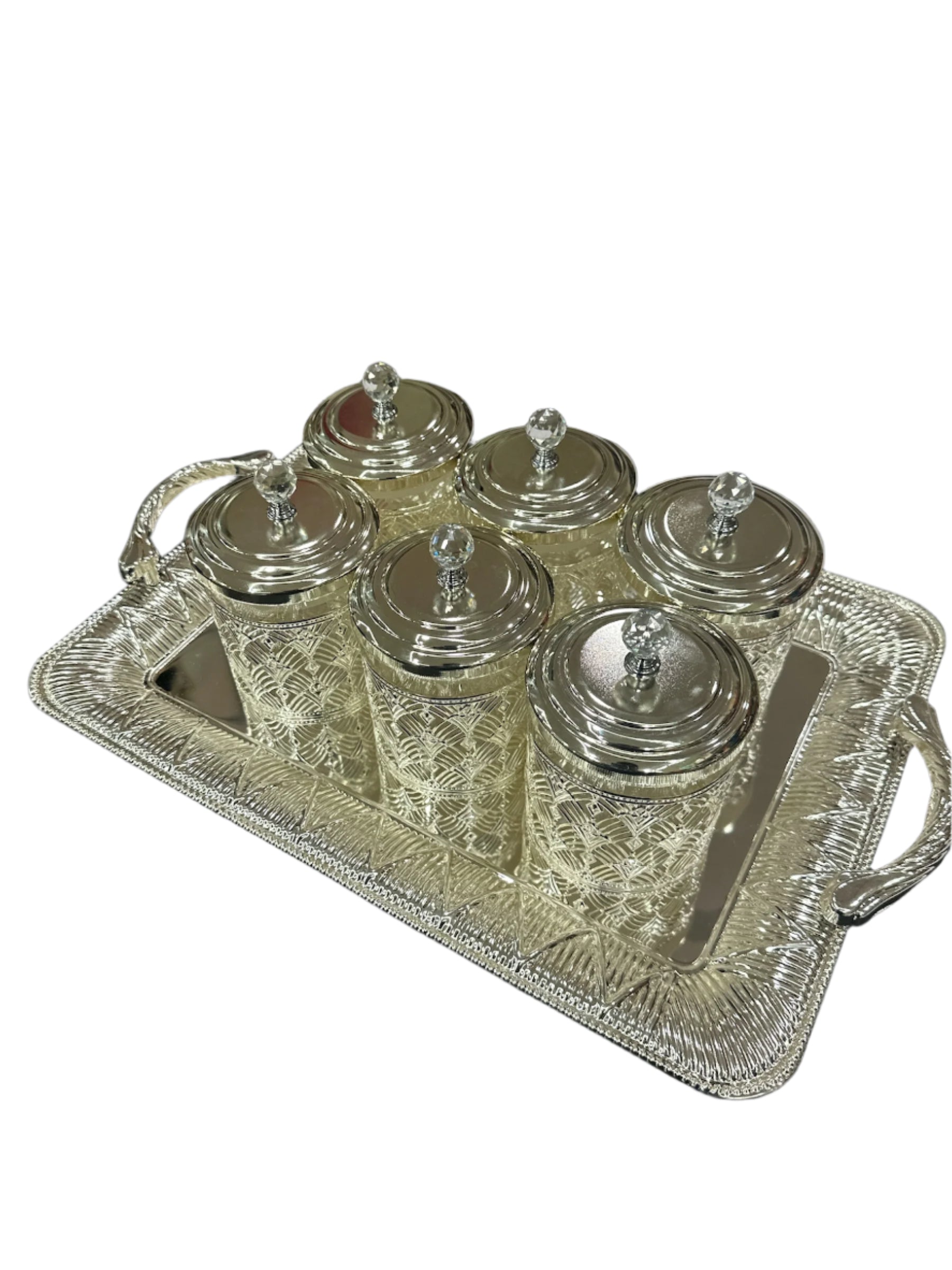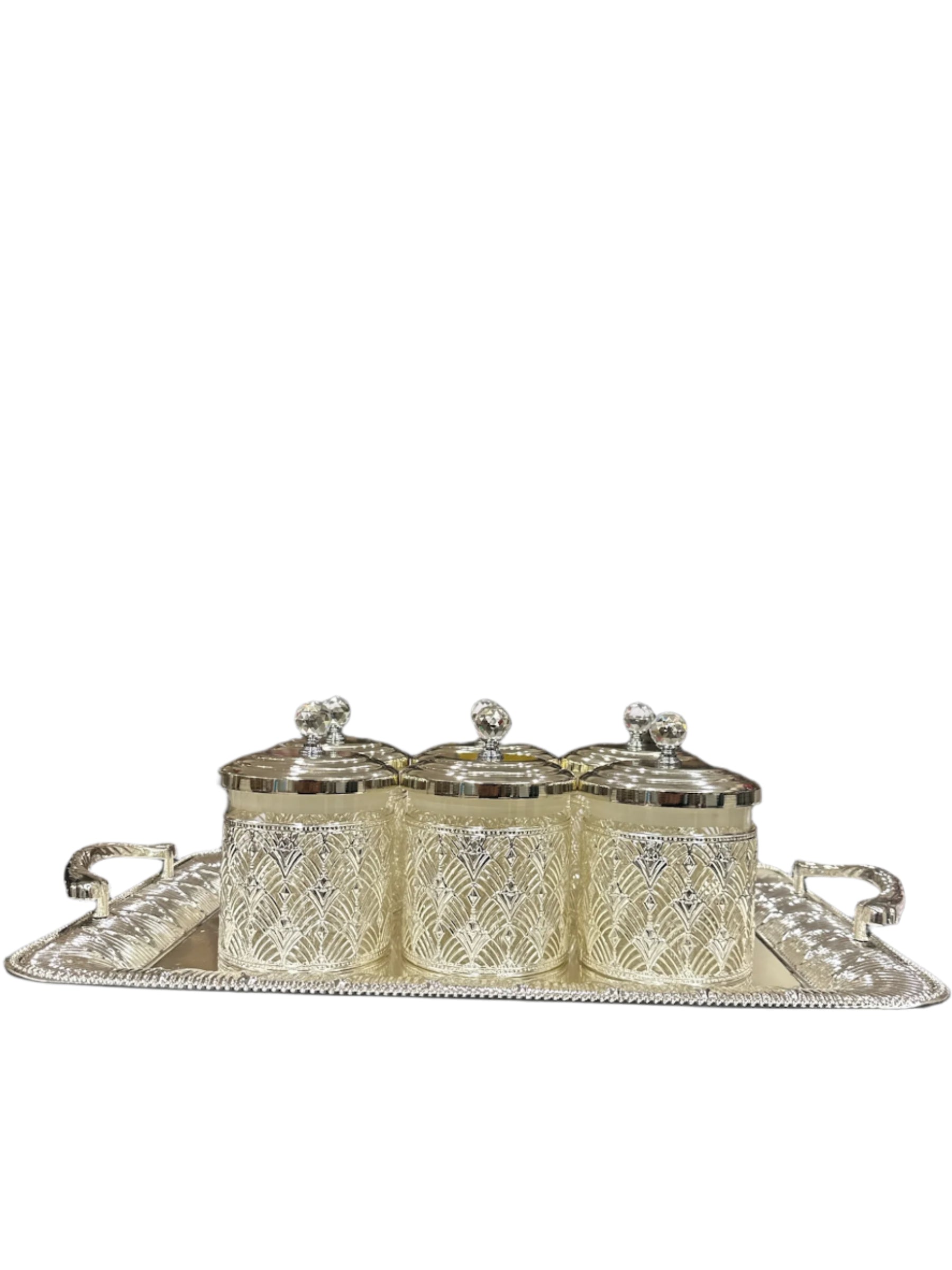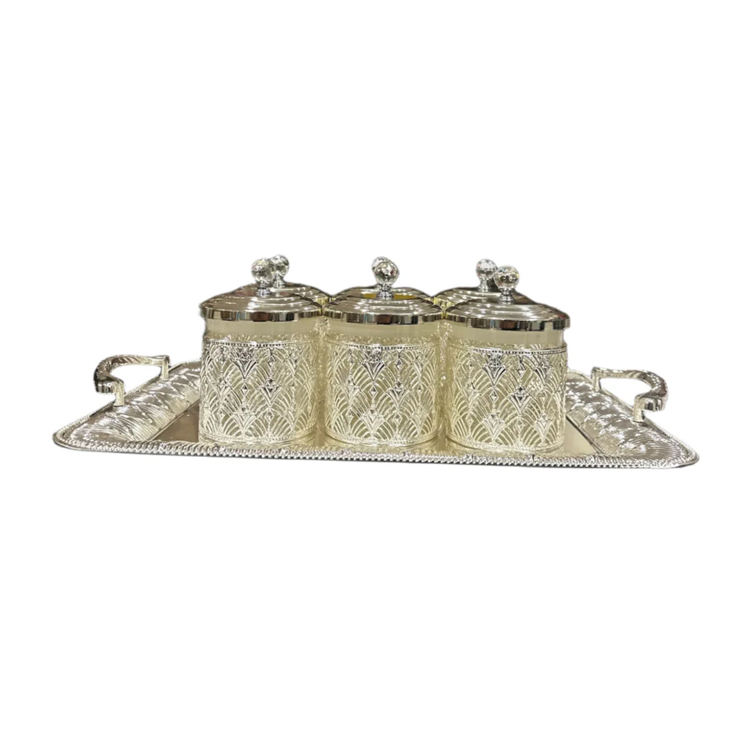 • Matching Tray: The set comes with a decorative silver tray with handles, providing a cohesive and stylish way to organize and display the jars.