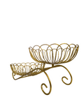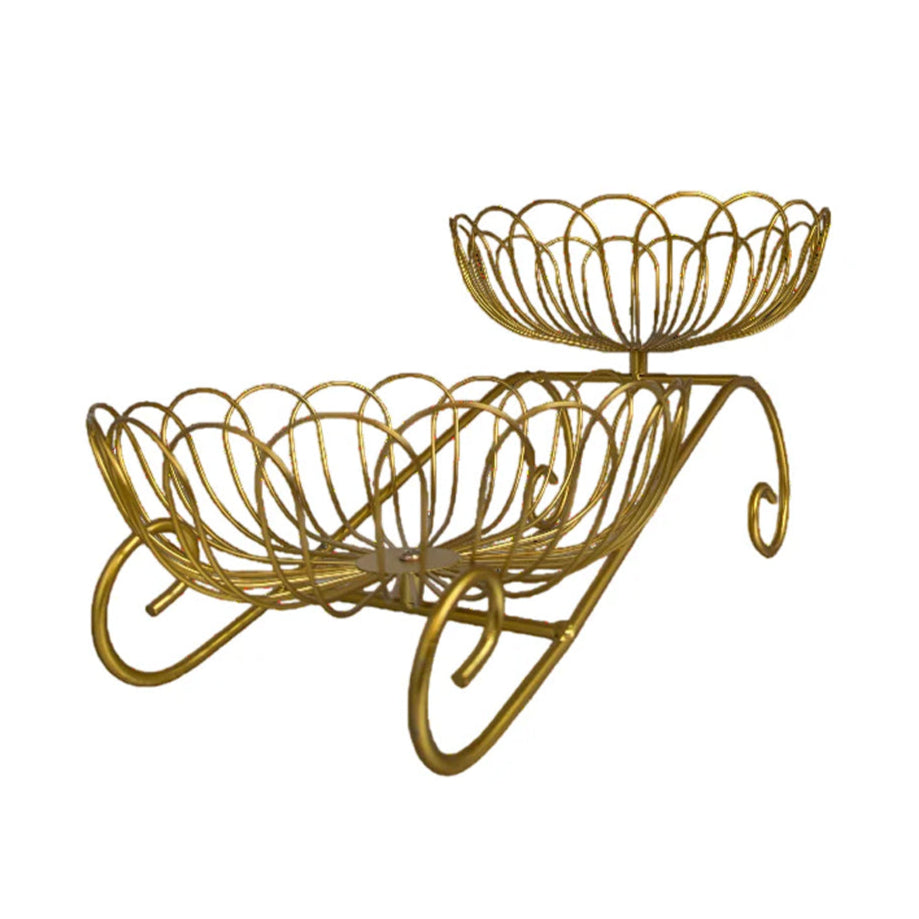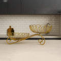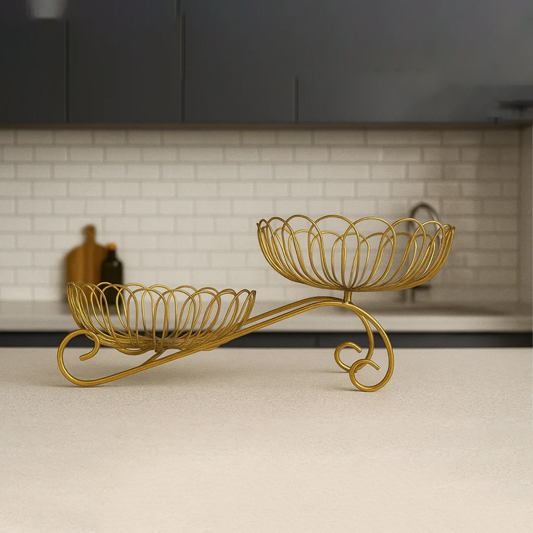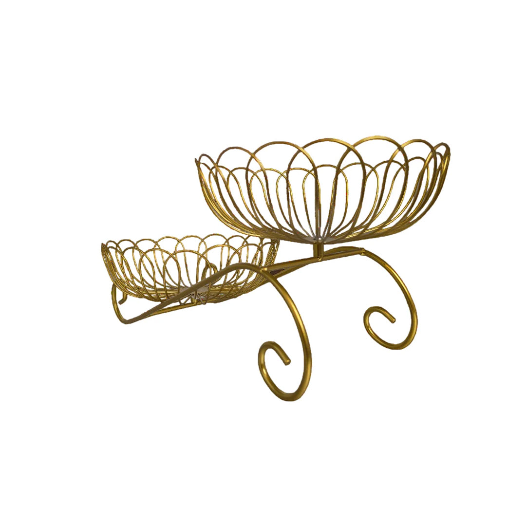 Add elegance and style to your home with this Golden Double Tiered Wire Fruit Basket Stand. Designed with a modern and sophisticated aesthetic, this unique stand features two beautifully crafted wire baskets with a delicate floral pattern, one elevated above the other. The gold finish gives it a luxurious feel, making it an ideal addition to any kitchen, dining table, or living area.
