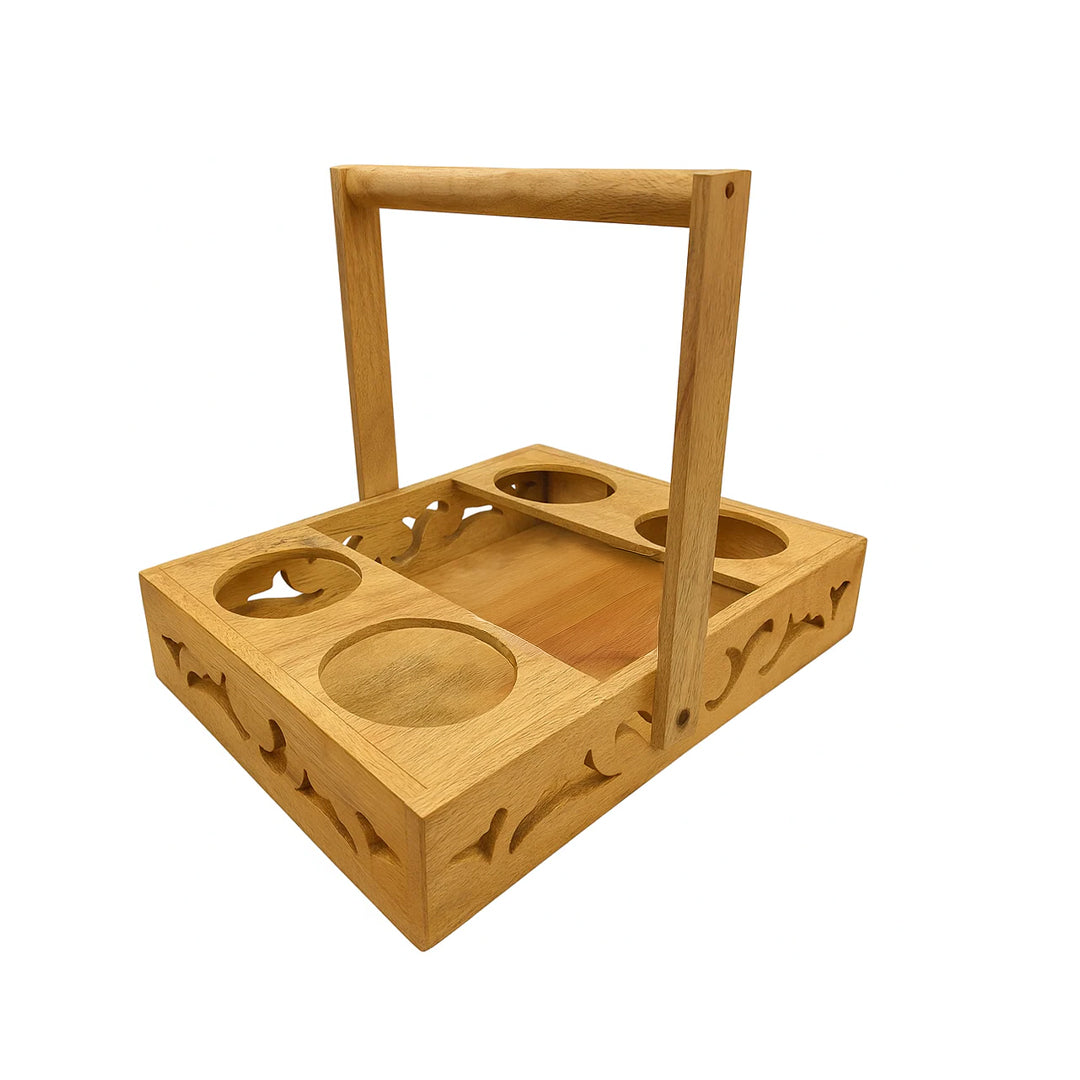 - Design: Wooden Basket with Handle, 4 circular compartments