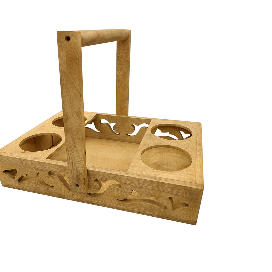 Bring timeless craftsmanship and natural charm into your home with this Handcrafted Wooden Basket with Handle. Designed to blend functionality with rustic elegance, this wooden carrier is perfect for organizing bottles, jars, or decorative items. The intricate cut-out design along the sides and the sturdy handle make it both a beautiful display piece and a practical storage solution.