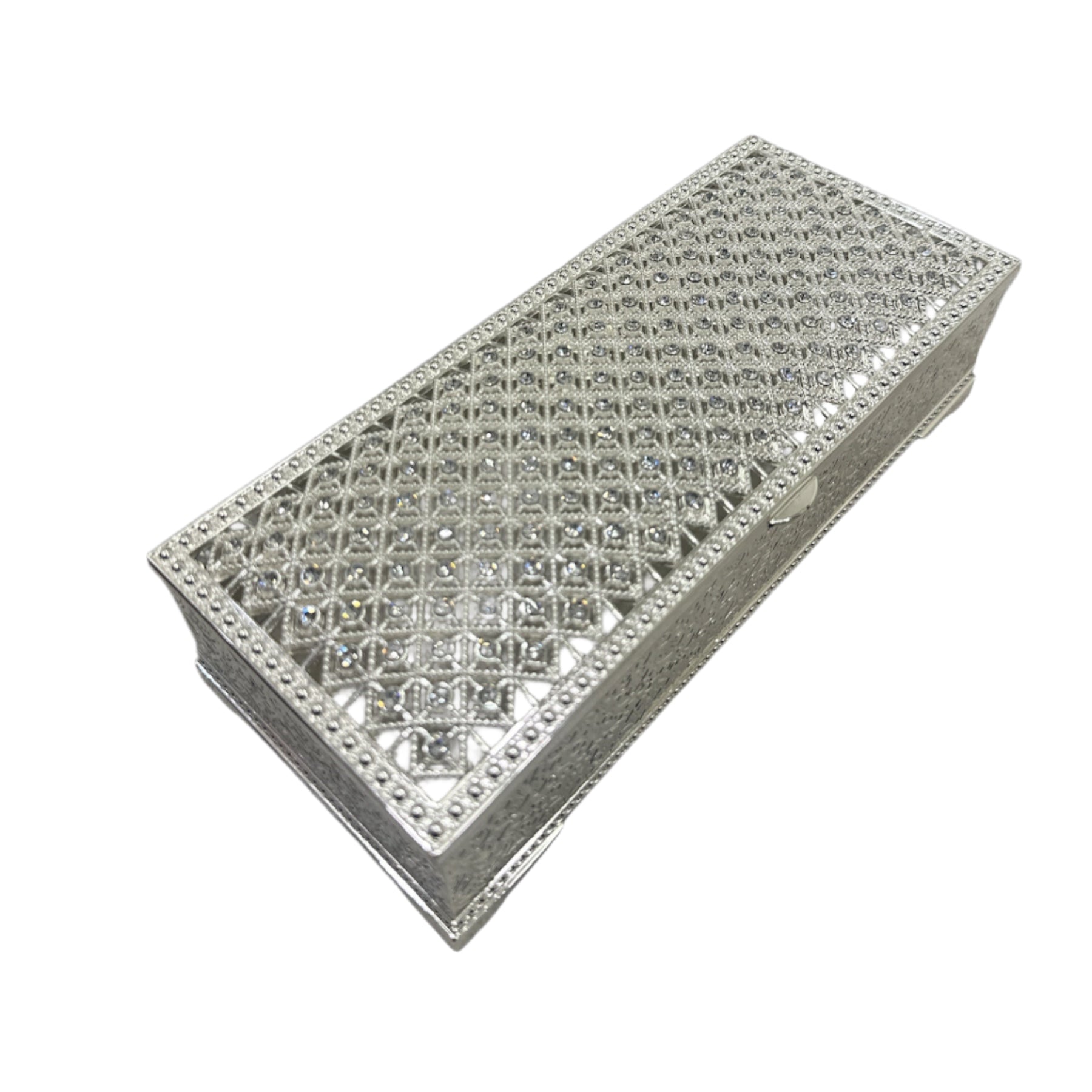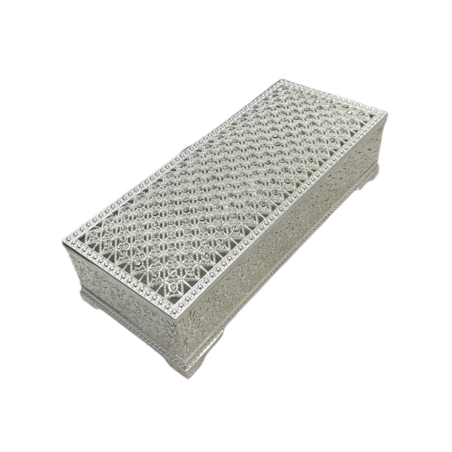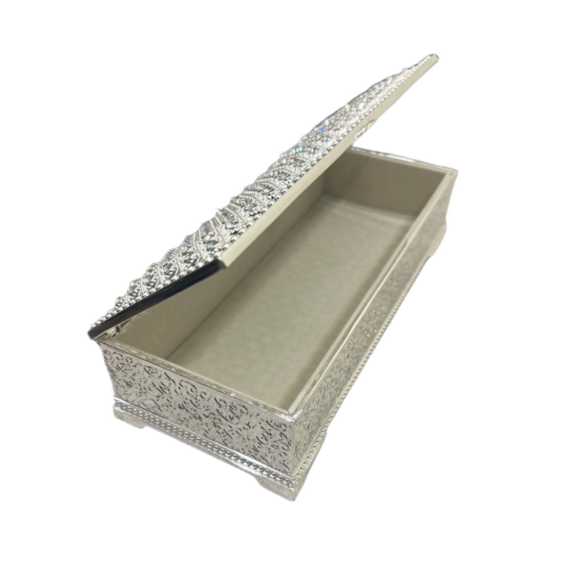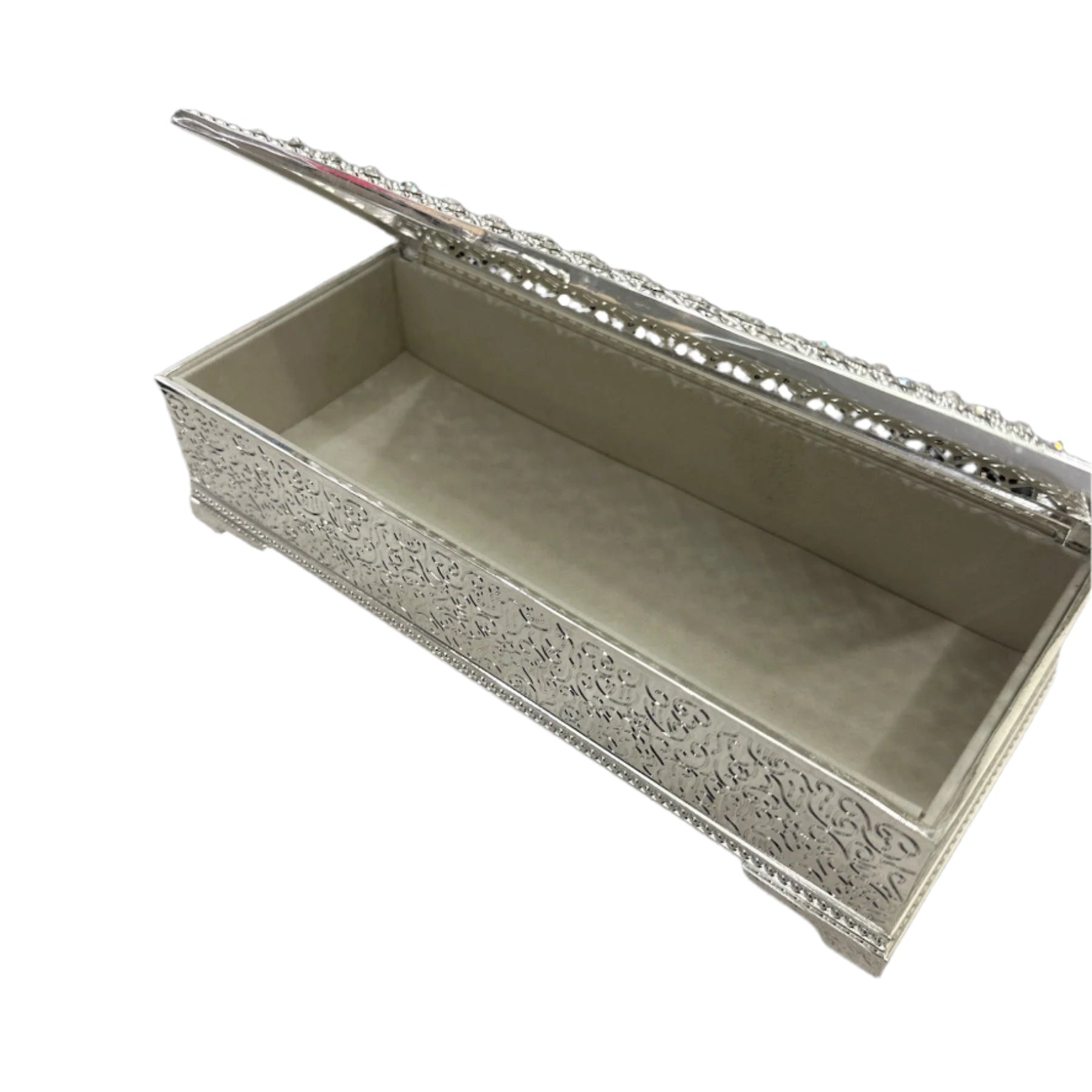 Elevate your décor and storage solutions with this exquisite Vintage Style Silver With Velvet Lining Box. Designed with refined craftsmanship, this rectangular box features a beautifully embossed floral and geometric pattern across its exterior, exuding timeless elegance and vintage charm. The hinged lid is adorned with a delicately raised crystal-studded lattice, adding a touch of sparkle and sophistication. Offered along a premium vegan leather casing.