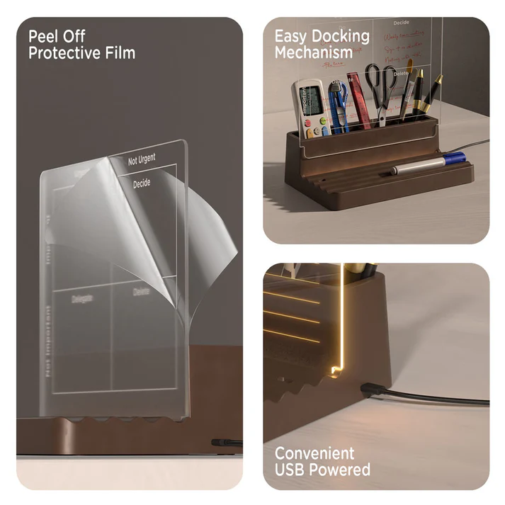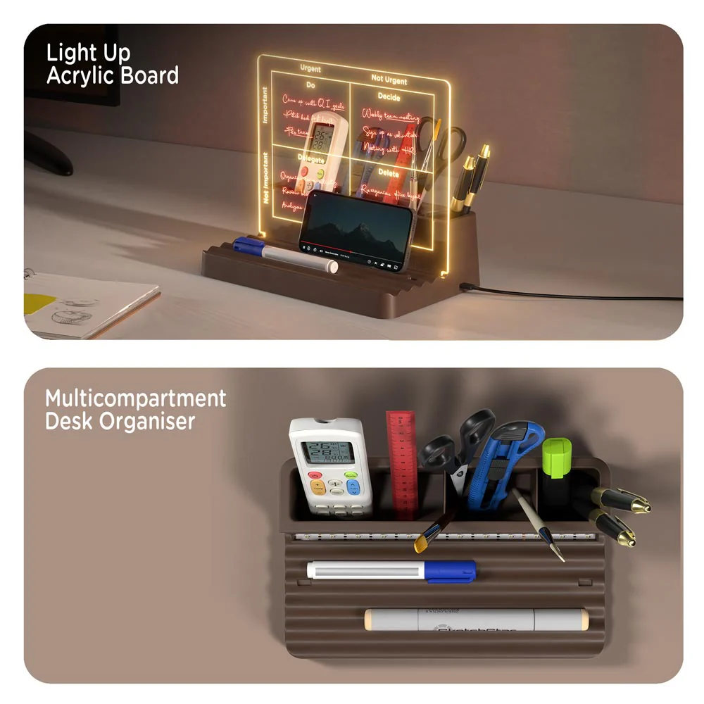 Stay organized in style with this innovative LED Acrylic Memo Board and Desk Organizer. Featuring a crystal-clear illuminated acrylic board for jotting down tasks, reminders, or motivational notes, this desk accessory also doubles as a smart organizer for your stationery and gadgets. With its modern design and glowing surface, it adds both functionality and elegance to your workspace, making your daily planning effortless and visually appealing.