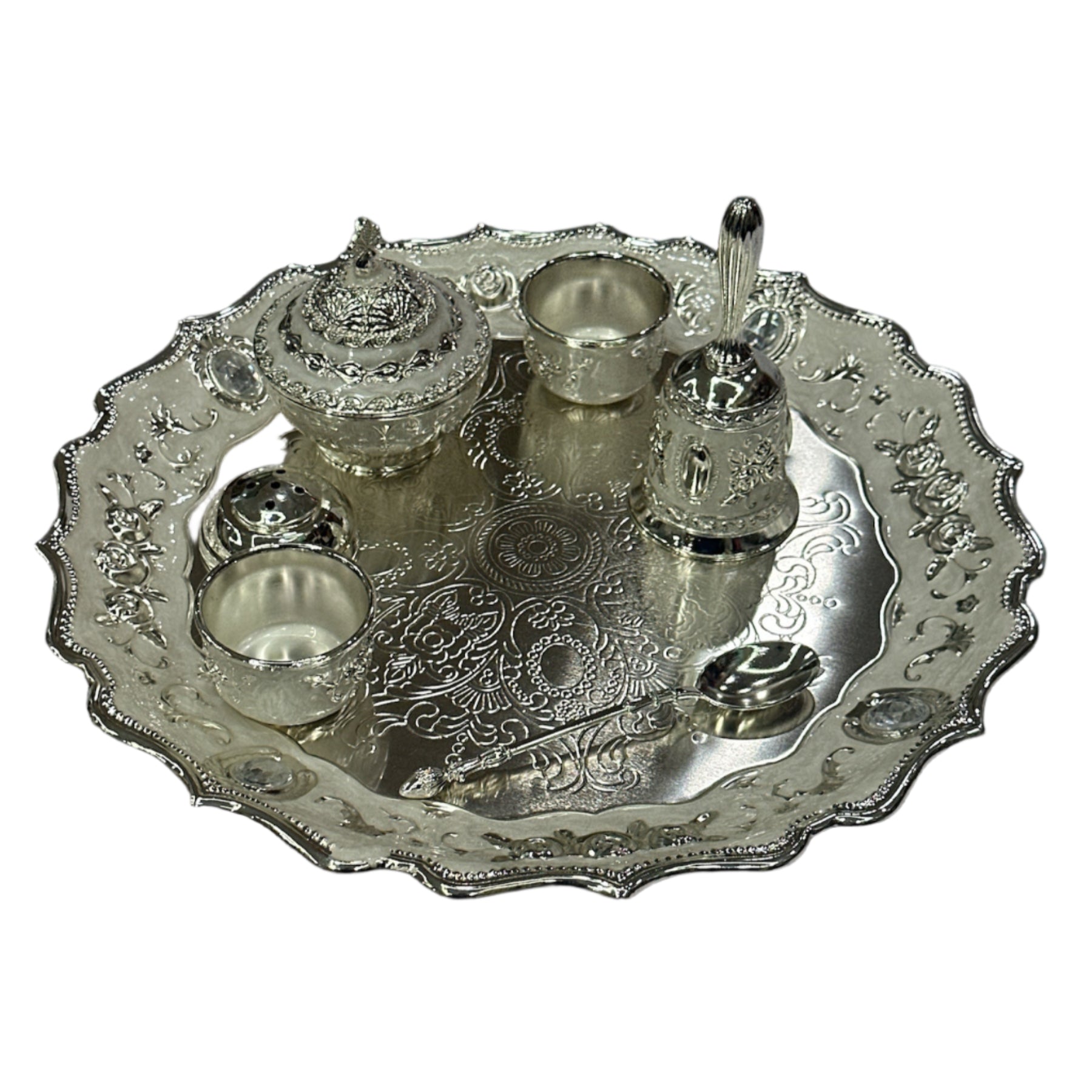 Ornate Silver Pooja Thali Set with Decorative Bell and Spoon