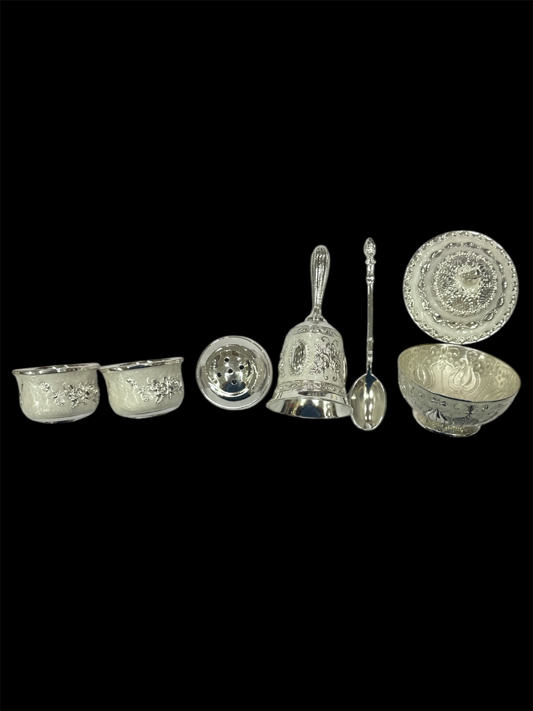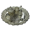 Introducing the Ornate Silver Pooja Thali Set with Decorative Bell and Spoon, a beautifully crafted set designed for traditional religious rituals and celebrations. This elegant set features a meticulously detailed silver-plated thali with intricate floral engravings, complemented by a range of ritual items, including bowls, a bell, a spoon, and a beautifully embossed bowl. The delicate craftsmanship and ornamental designs make this Pooja thali set a perfect addition to your puja room or as a thoughtful gift for loved ones. Its polished silver finish and ornate detailing add a touch of sophistication to your spiritual practices, making each ceremony more special.