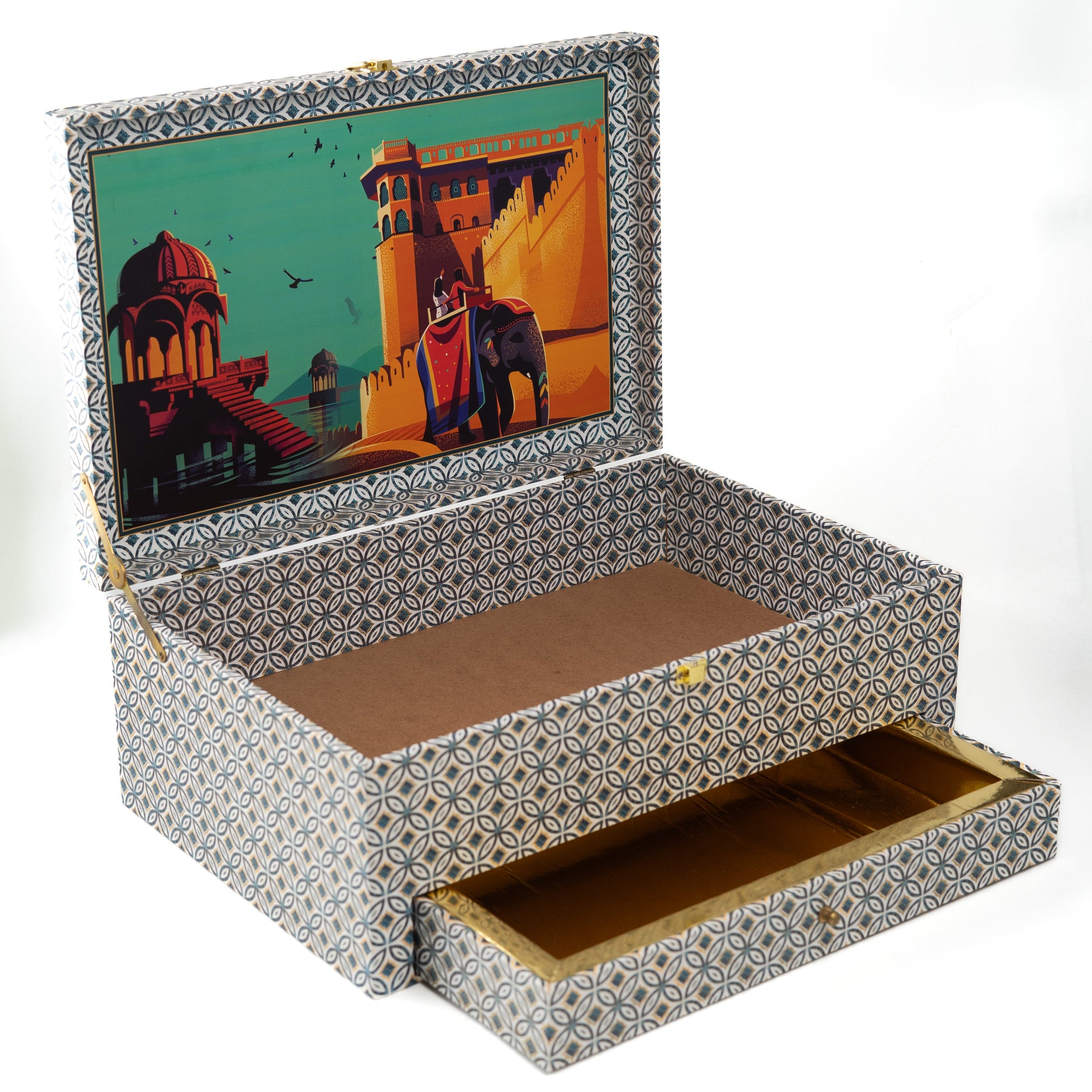 Beautiful geometric print on the exterior with a striking palace-themed artwork inside the lid, adding charm and elegance.