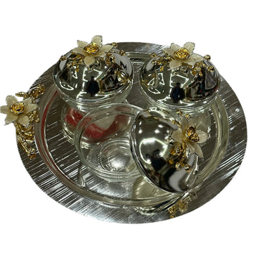Introducing the Opulent Flower-Inspired Glass Bowl Set with Gold Lids a stunning combination of elegance and functionality. This beautifully designed set includes multiple glass containers, each adorned with delicate golden floral accents, making them not only practical but a true centerpiece for any decor. The lids feature finely detailed gold-plated flowers that add an opulent touch, while the smooth, transparent glass provides a clear view of the contents within. Perfect for storing trinkets, candies, jewellery, or even as decorative display pieces, this set combines style with utility, adding a sophisticated charm to your home or office.