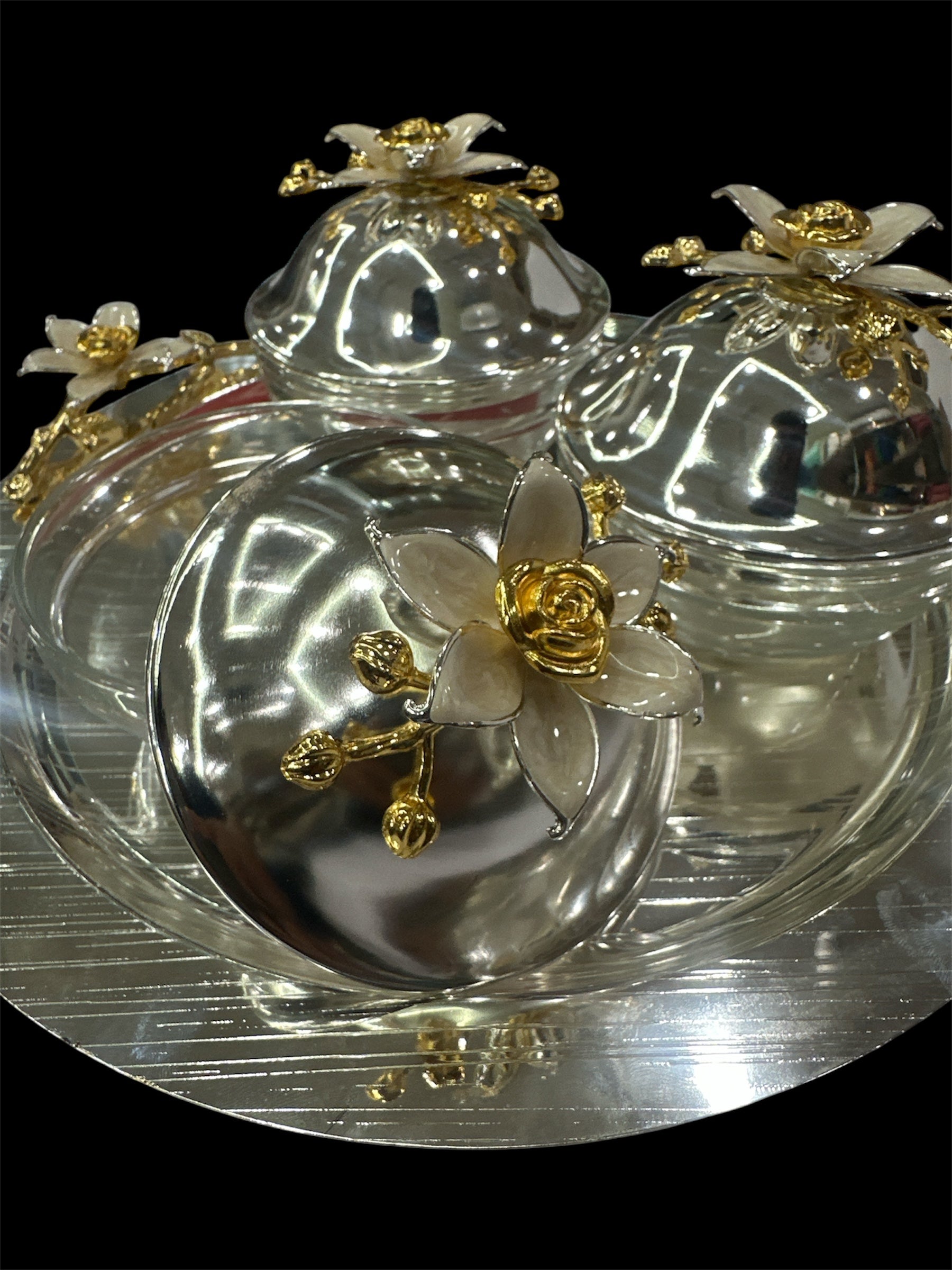 • Gold-Plated Floral Details: Each lid is beautifully decorated with a gold-plated flower motif, adding an exquisite touch of opulence.