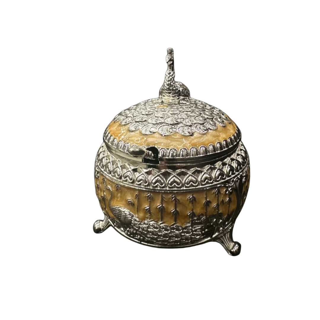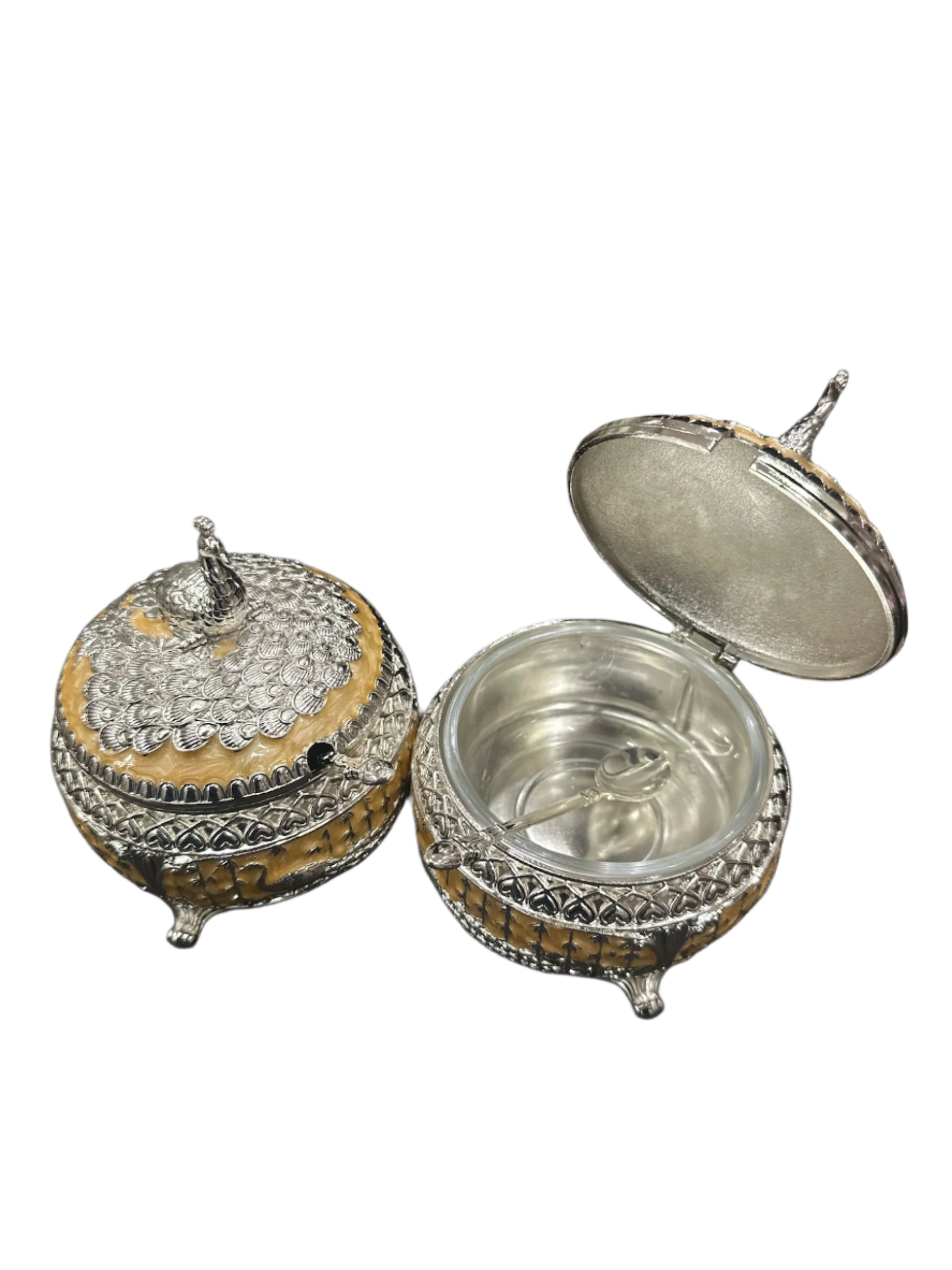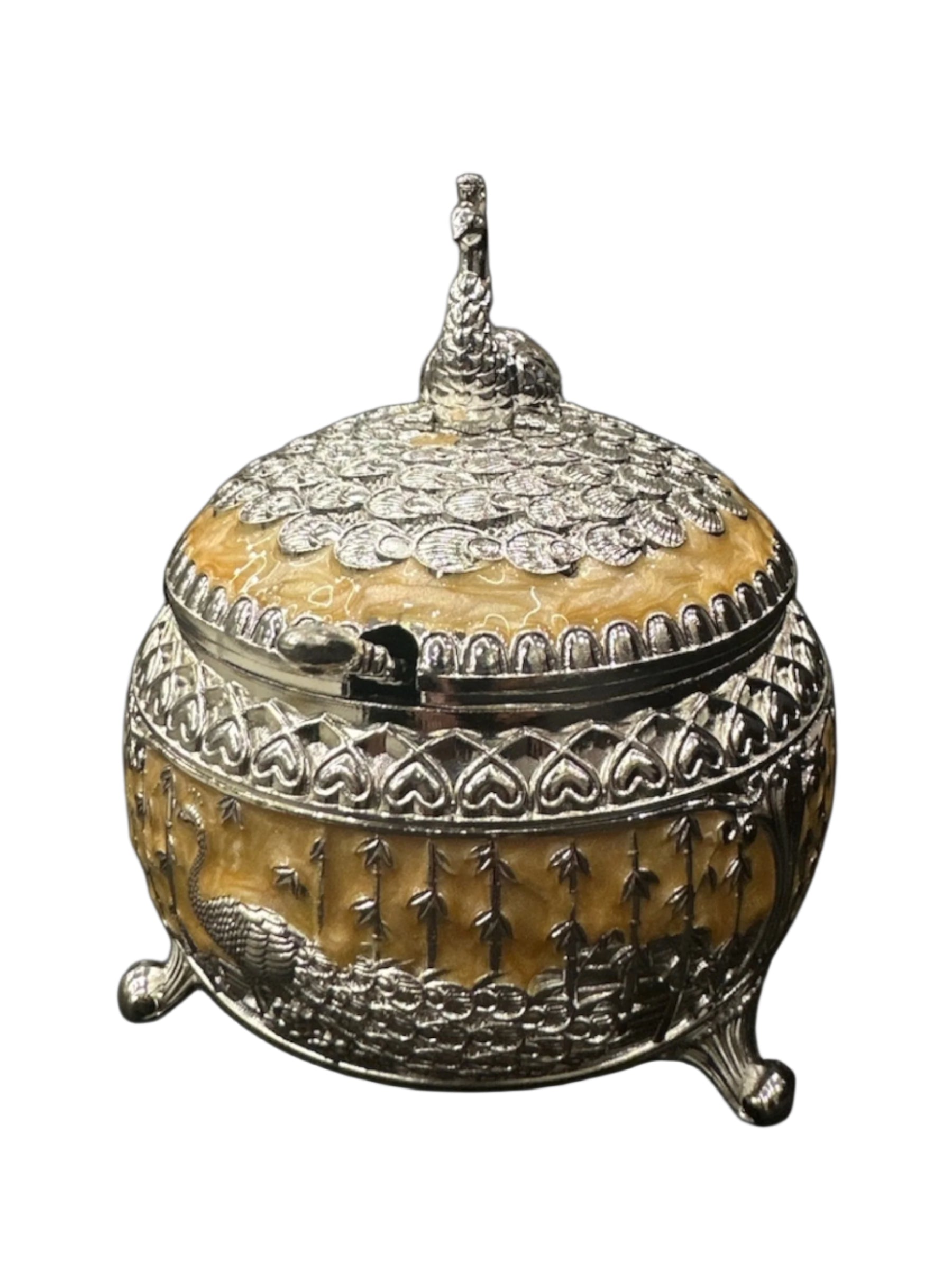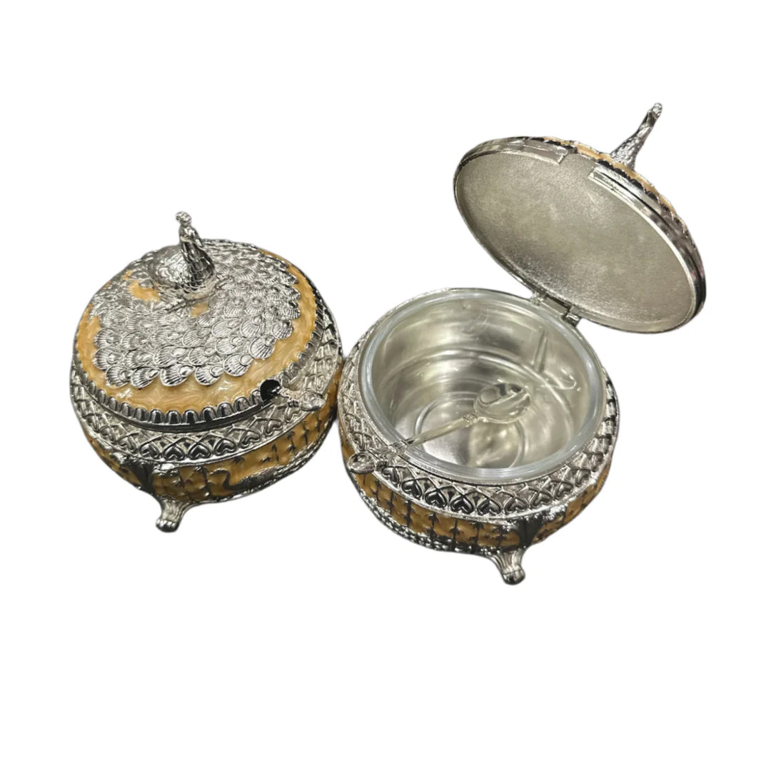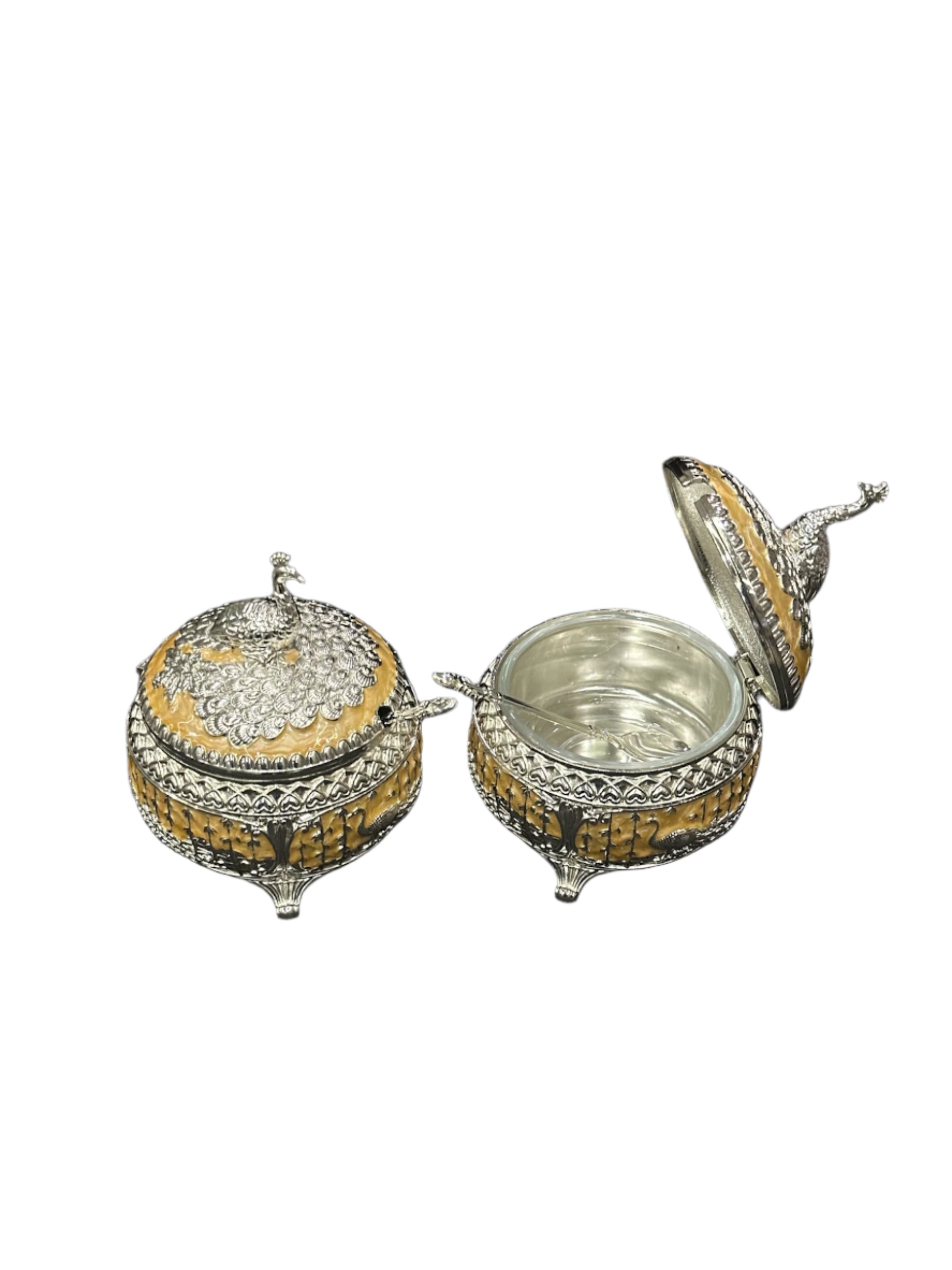 This Majestic Peacock Silver Accents Sugar Bowls Set brings an air of sophistication and grace to any space. Crafted with meticulous attention to detail, these boxes feature an elegant silver-plated finish with intricate peacock designs on the lid and sides. The beautiful golden-hued base offers a stunning contrast, complemented by delicate accents of silver that give each piece its distinct, regal charm.