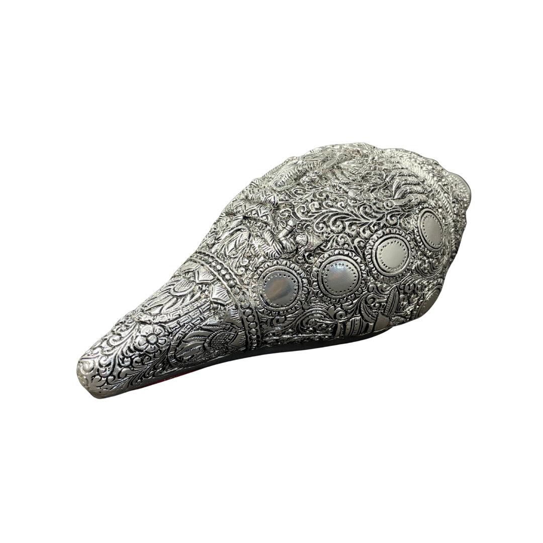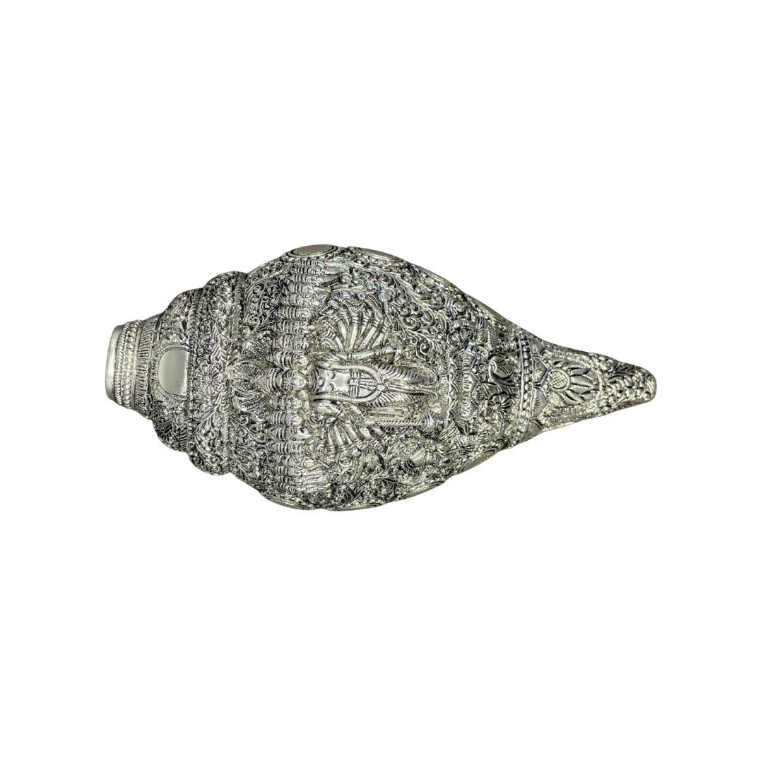 Enhance your spiritual ambience with this Divine Lord Vishnu Mahaavtara Carved Shankh, a masterpiece of traditional craftsmanship and cultural devotion. Designed in a stunning silver-tone finish, the conch shell features intricate embossed carvings of divine motifs, floral patterns, and mythological elements, making it not just a religious accessory but a striking piece of art.