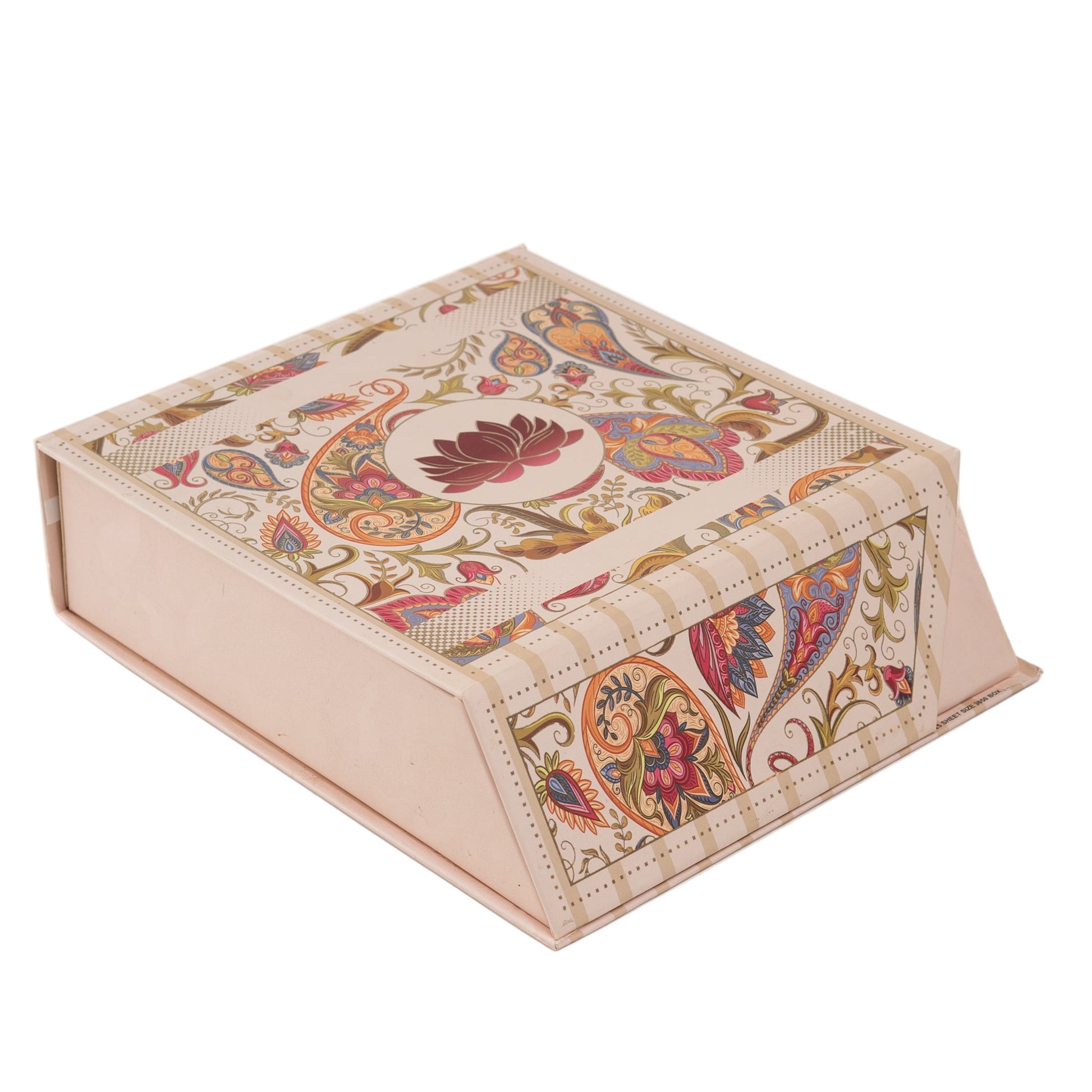 Elevate your festive gifting with this Royal Lotus Themed Rigid Box with Magnetic Closure & Four Partitions, crafted to combine elegance, durability, and thoughtful detailing. Featuring a beautifully printed floral exterior with a prominent lotus centerpiece, this box blends traditional artistry with modern aesthetics.