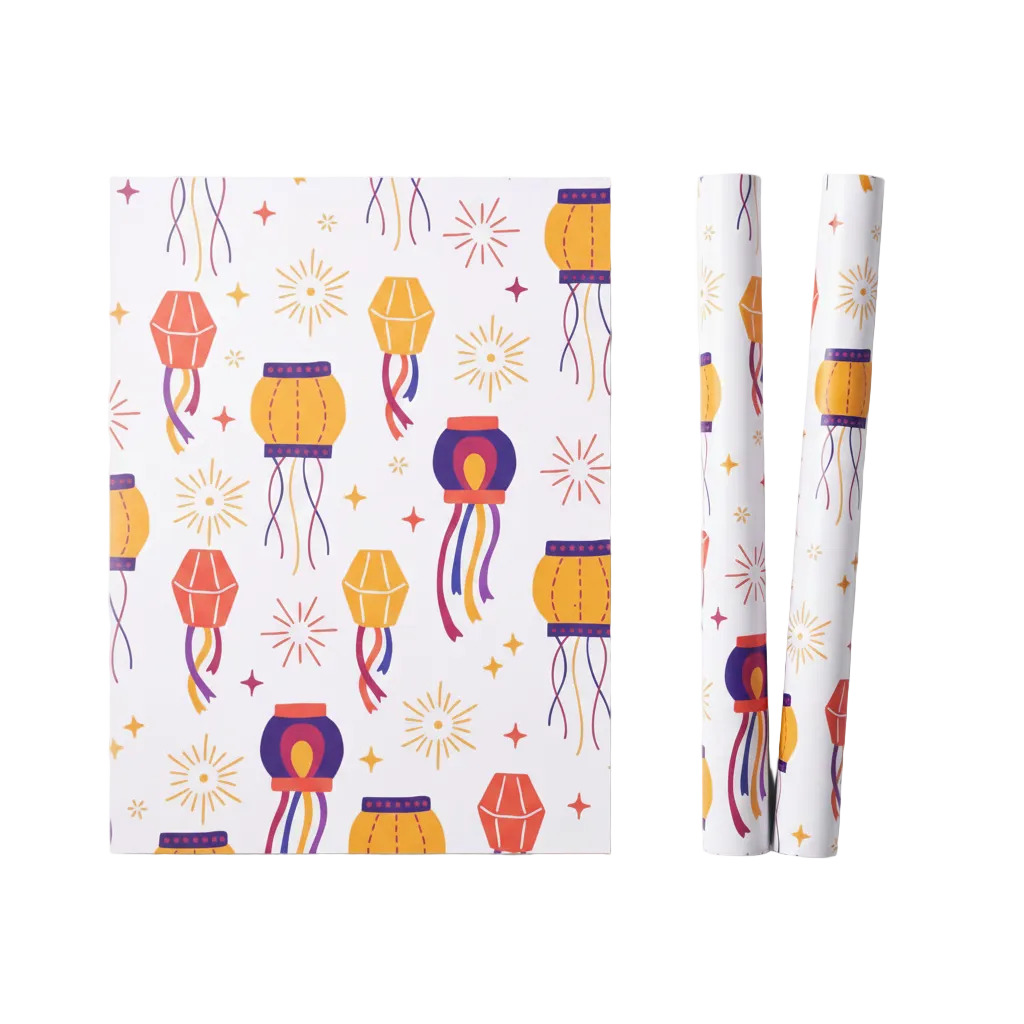 Light up your gifting moments with this Joyful Lantern Burst Gift Wrap Paper, featuring a lively array of colorful lanterns and radiant starbursts. The bright palette of yellow, orange, purple, and red adds a joyful and celebratory feel to any occasion. Designed with a playful, artistic style, this wrapping paper brings instant charm and cultural festivity to your gifts.