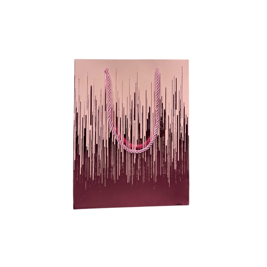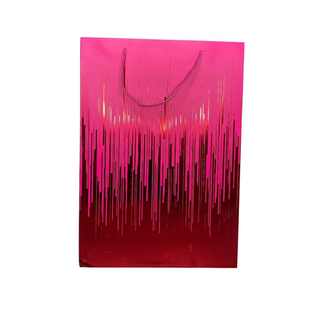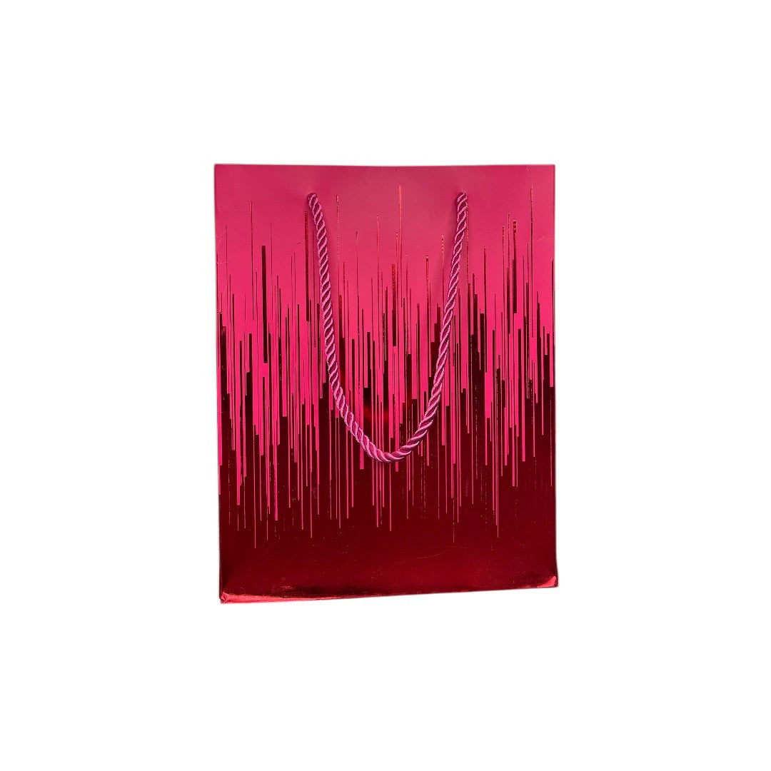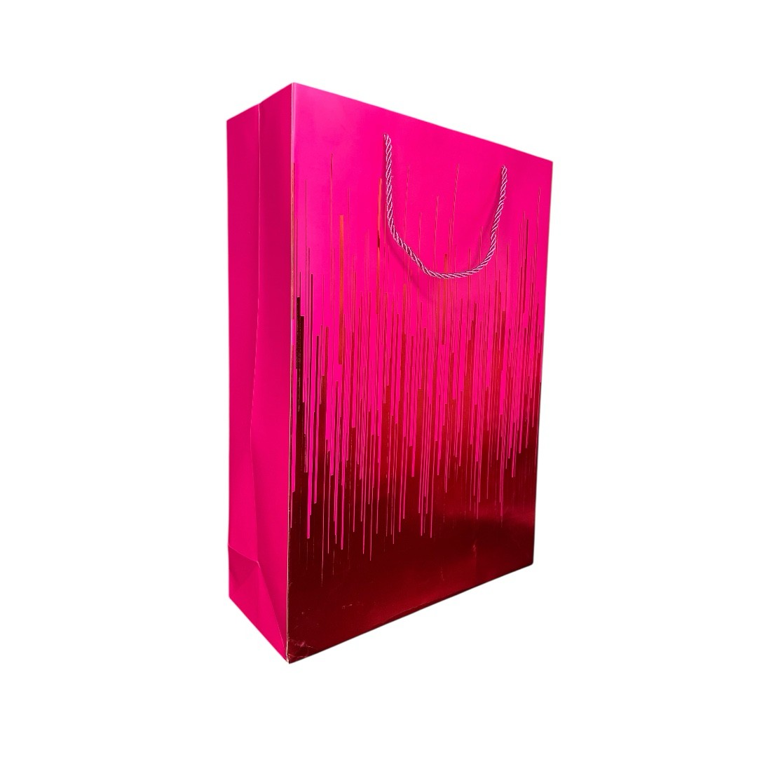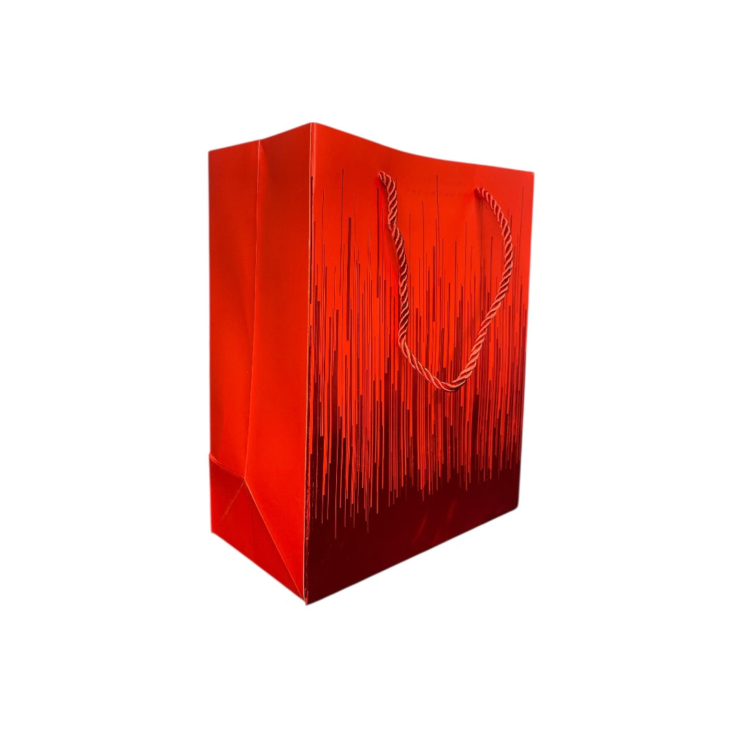 Add a bold touch of elegance to your gifts with this Stylish Metallic Paper Bag with Twisted Rope Handle, designed with a modern vertical line foil print for a sophisticated finish. The shiny red surface paired with a sturdy twisted rope handle makes this bag both fashionable and functional.