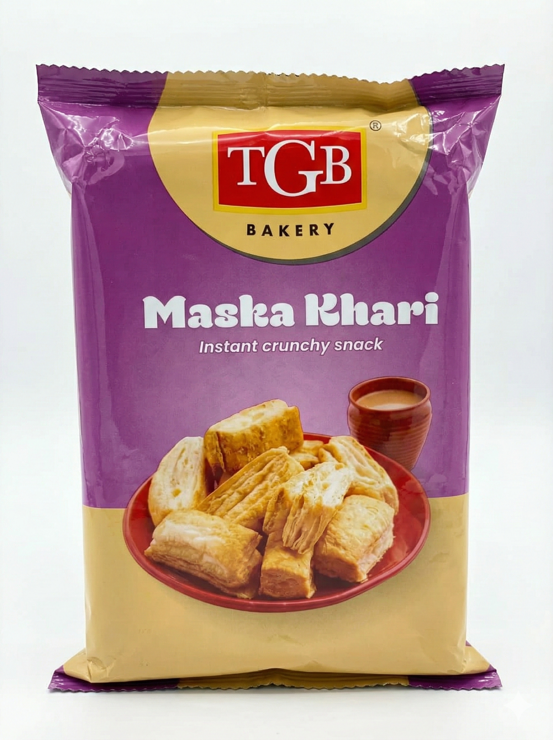 The packaging showcases the product with appealing visuals, emphasizing its freshness and premium bakery quality. Whether for home snacking, gifting, or serving guests, TGB’s Maska Khari brings the authentic bakery experience right to your home.