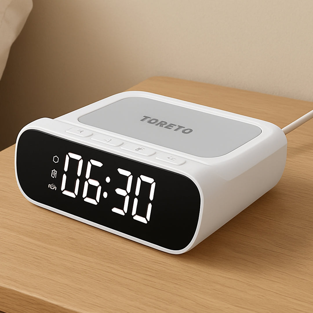 Start your mornings smarter with the Toreto Powertick, a 2-in-1 wireless charging alarm clock. Designed for modern lifestyles, it combines the convenience of fast wireless charging with a sleek LED digital clock & alarm system.