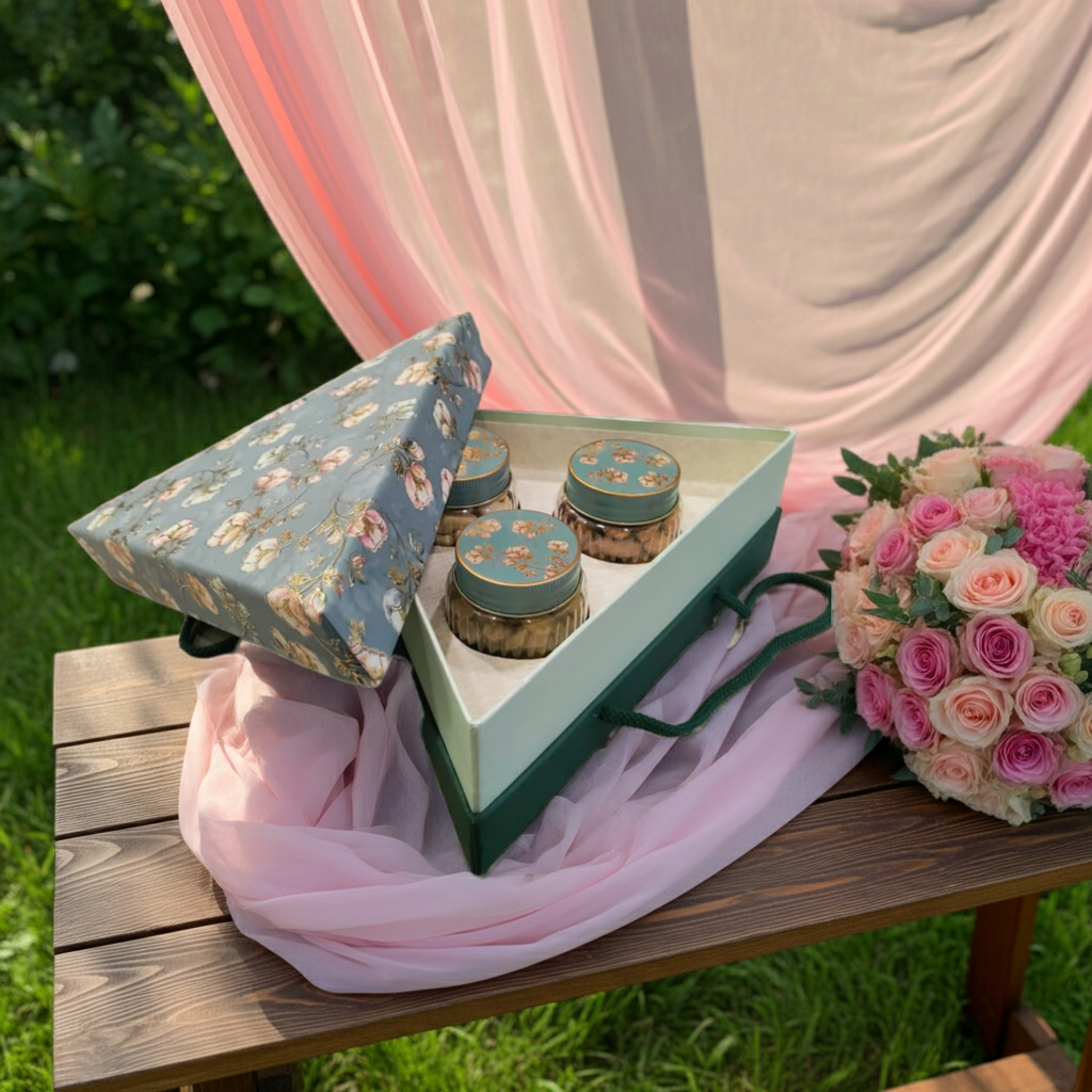 Β A modern, elegant, and thoughtful return gift designed specially for this wedding season. This triangle-shaped premium box adds a luxurious touch to your celebrations, offering guests a healthy and classy treat theyβll truly appreciate.
