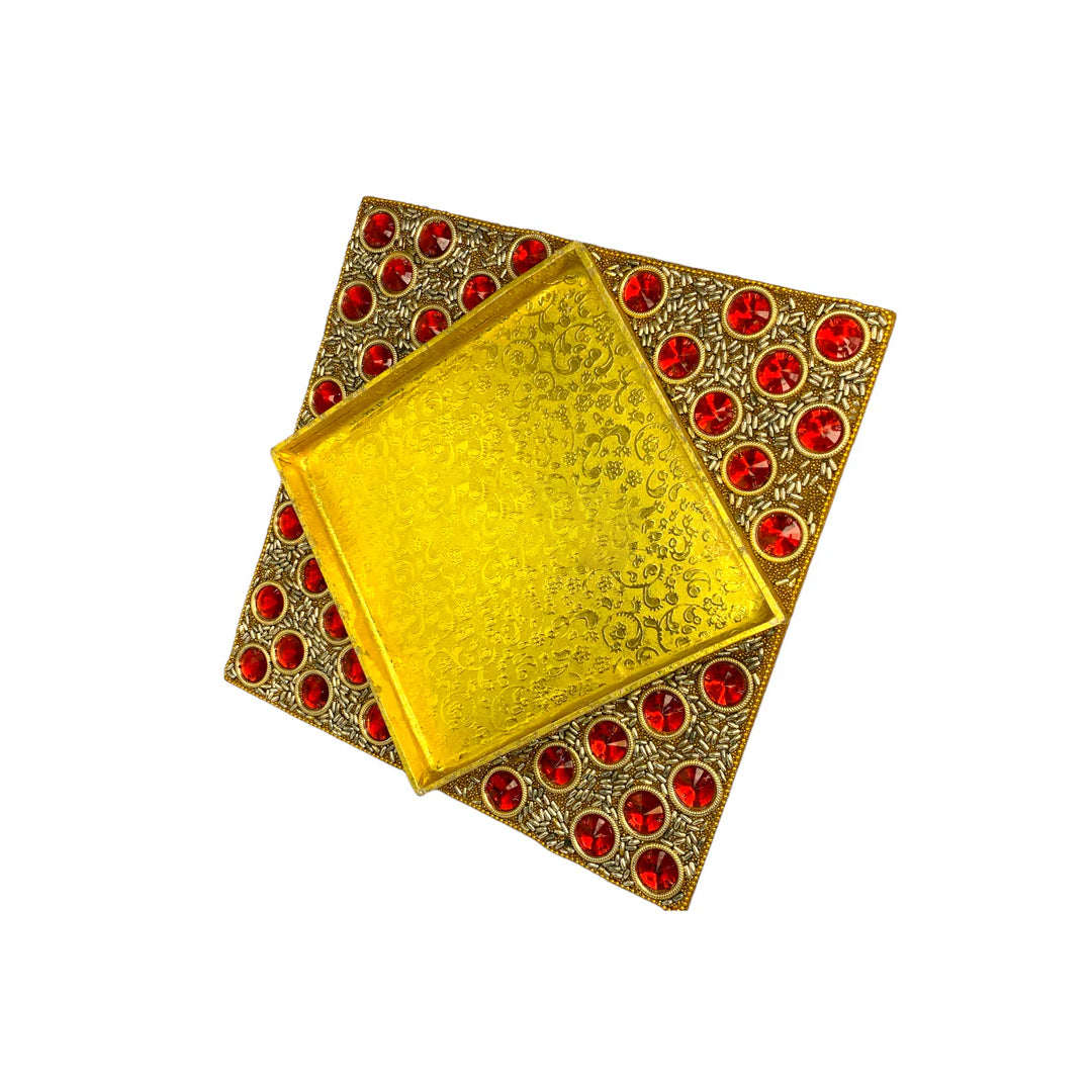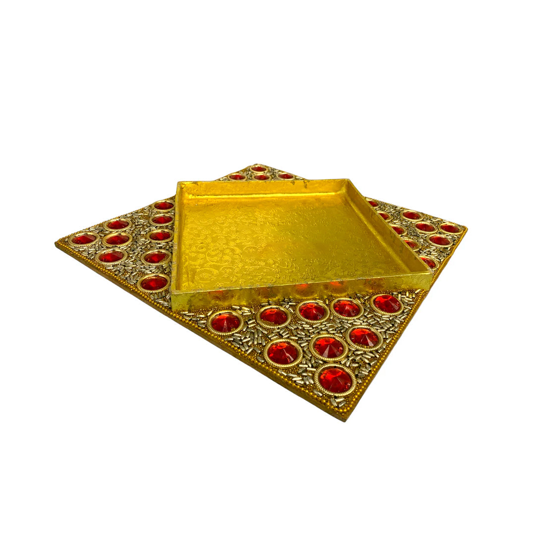 Enhance your living space with this Red Stone Embellished Golden Serving Tray. Featuring a classic square design, the tray is adorned with red stones around the border, creating a mesmerizing contrast against the gold finish. This tray is perfect for serving snacks, sweets, or as a decorative centerpiece for special occasions.