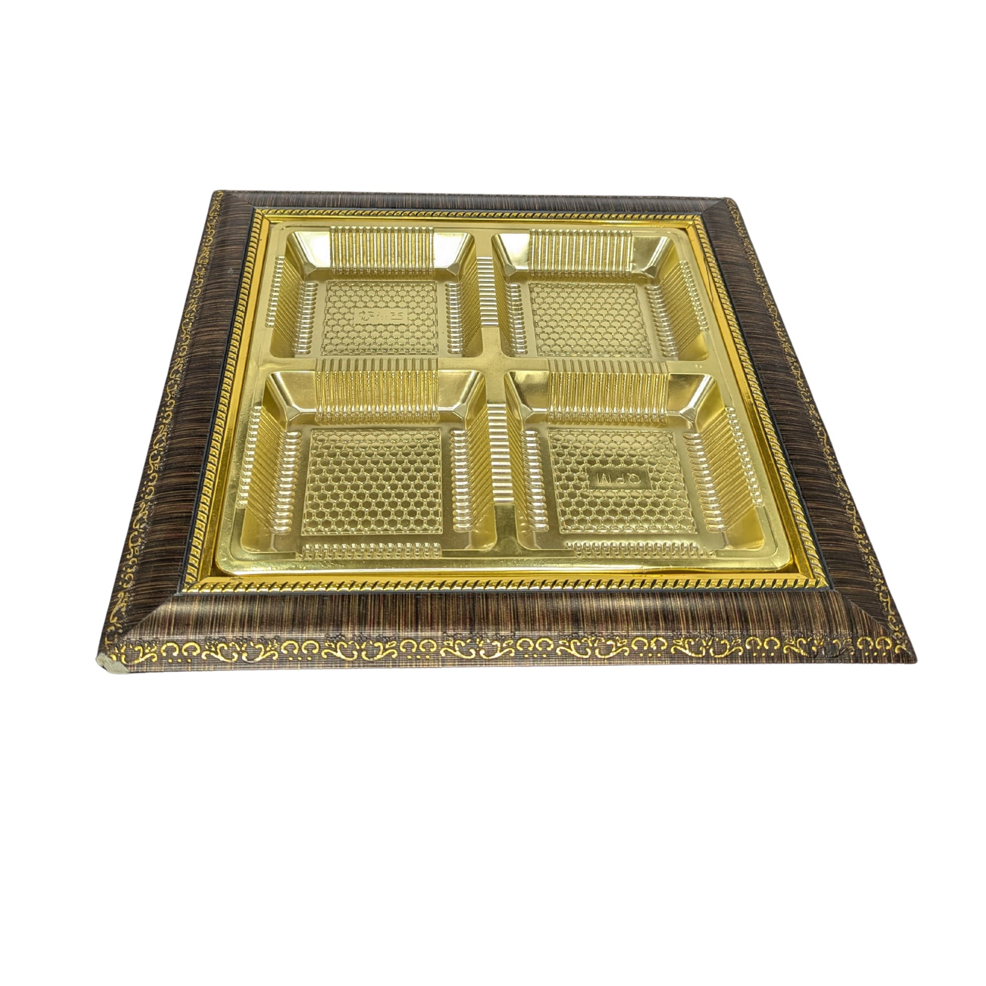 Bring a royal touch to your serving experience with this Elegant Golden Compartment Serving Tray. Crafted from high-quality plastic with a premium golden finish, this tray features four deep compartments, making it perfect for serving dry fruits, sweets, snacks, or namkeen in an organized and stylish way. The beautifully designed border enhances its aesthetic appeal, making it ideal for festive occasions, parties, or gifting purposes.