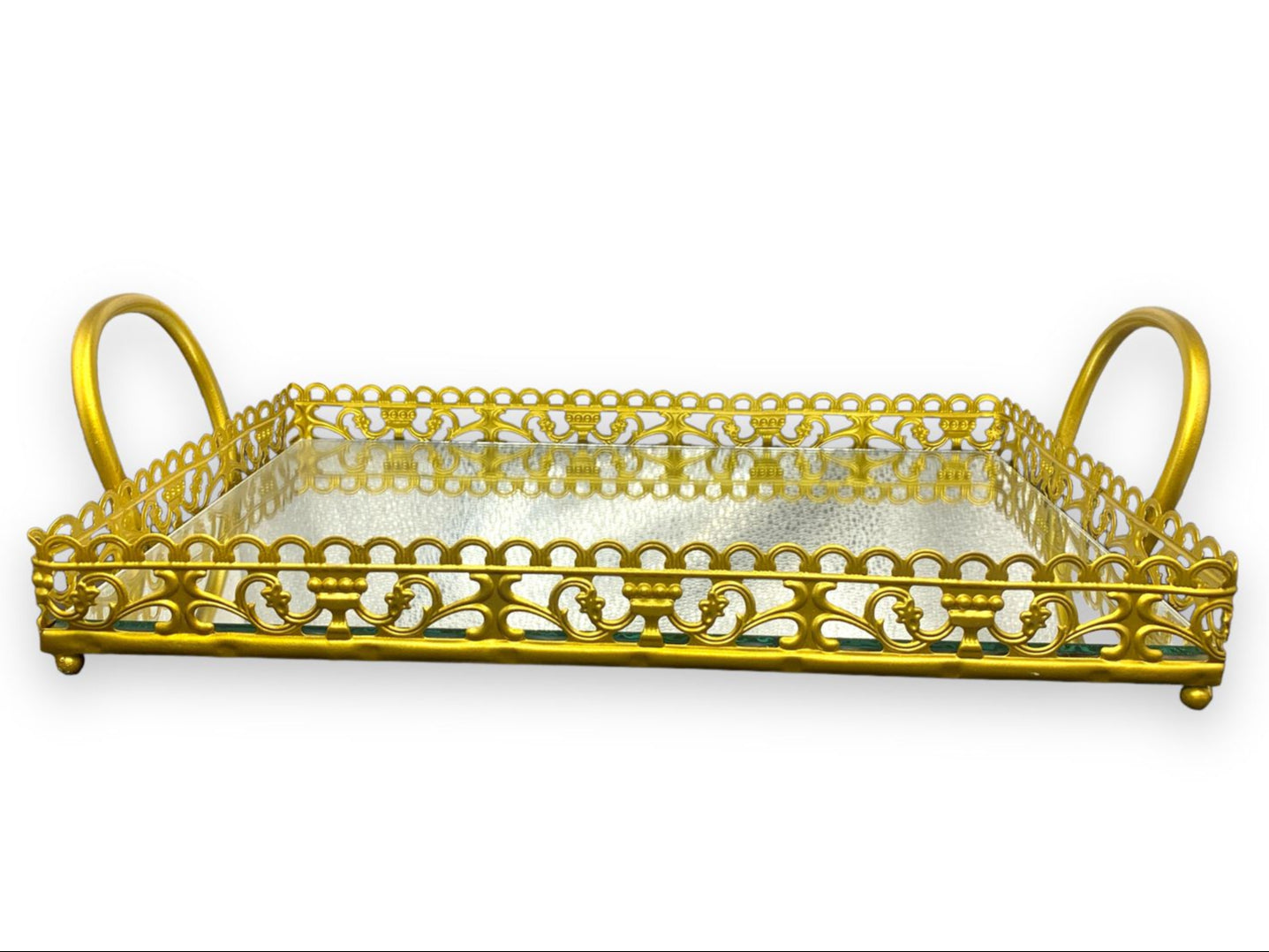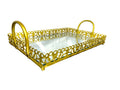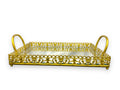 Serve in style with this Rich Gold Rectangular Cutwork Serving Tray, featuring a detailed openwork border and a reflective mirror base. Crafted from premium metal with a rich gold finish, this tray blends elegance with durability, making it a perfect addition to your home décor and serveware collection.