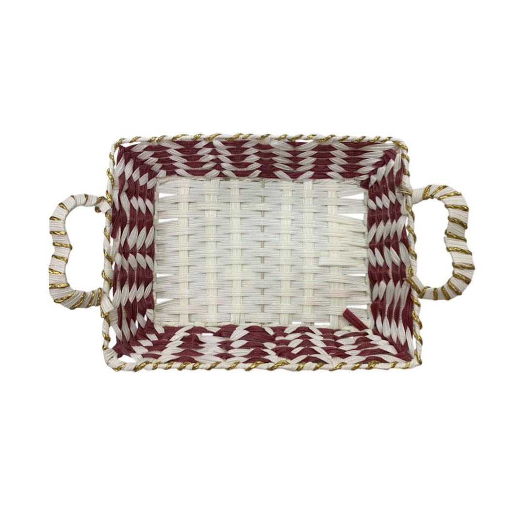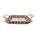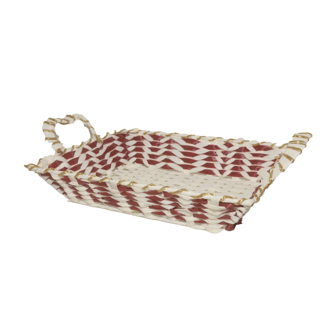Add a refined touch to your home with this Red & White Handwoven Basket Tray, beautifully crafted with vibrant red and white tones enhanced by shimmering golden accents. Designed in a classic rectangular shape with sturdy side handles, this tray combines traditional weaving artistry with modern functionality.